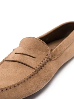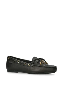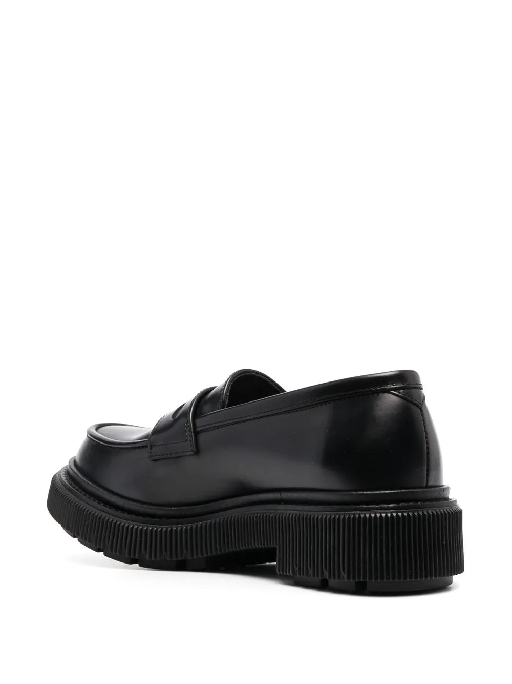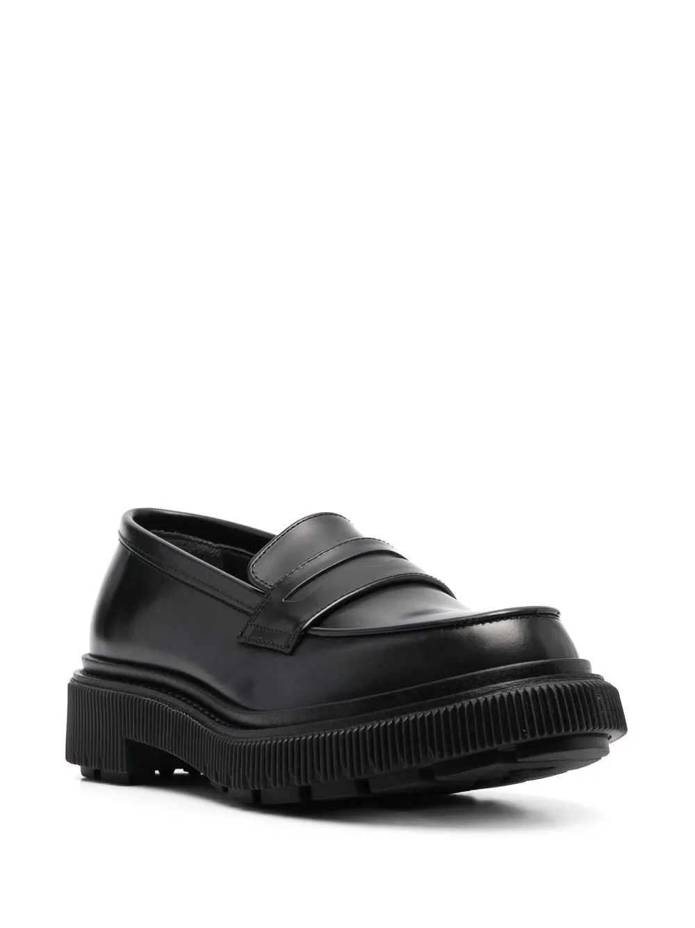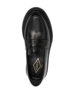 ridged-sole penny leather loafers from ADIEU PARIS featuring black, calf leather, penny slot, almond toe, slip-on style, branded insole and ridged rubber sole.