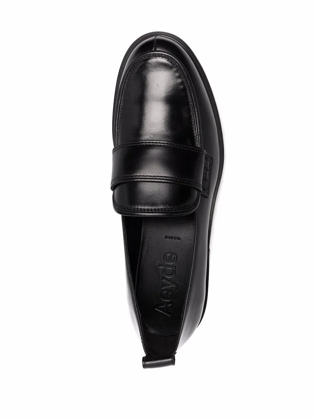 Black leather Ruth leather loafers from aeyde featuring crossover strap detail, pull-tab at the heel, slip-on style, round toe and flat rubber sole.