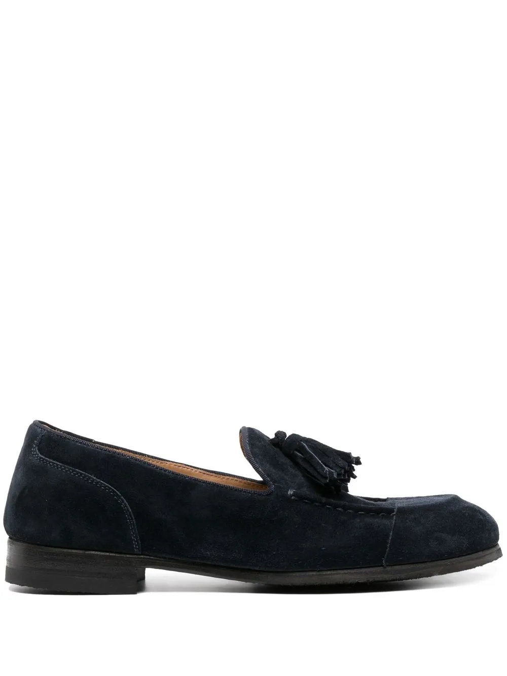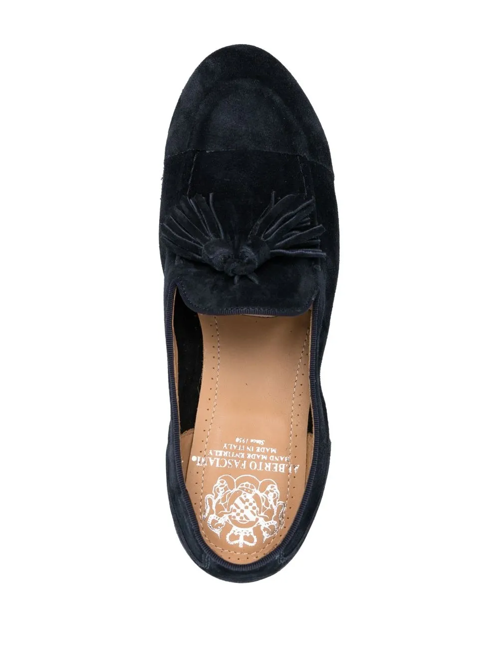 tassel-embellished suede loafers from ALBERTO FASCIANI featuring midnight blue, calf suede, calf leather, tassel detail, almond toe, branded insole, slip-on style, flat sole and low heel.