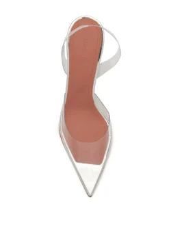 Transparent/silver leather/PVC Holliglass transparent pumps from AMINA MUADDI featuring pointed toe, branded insole, tonal stitching, slingback strap and high sculpted heel.