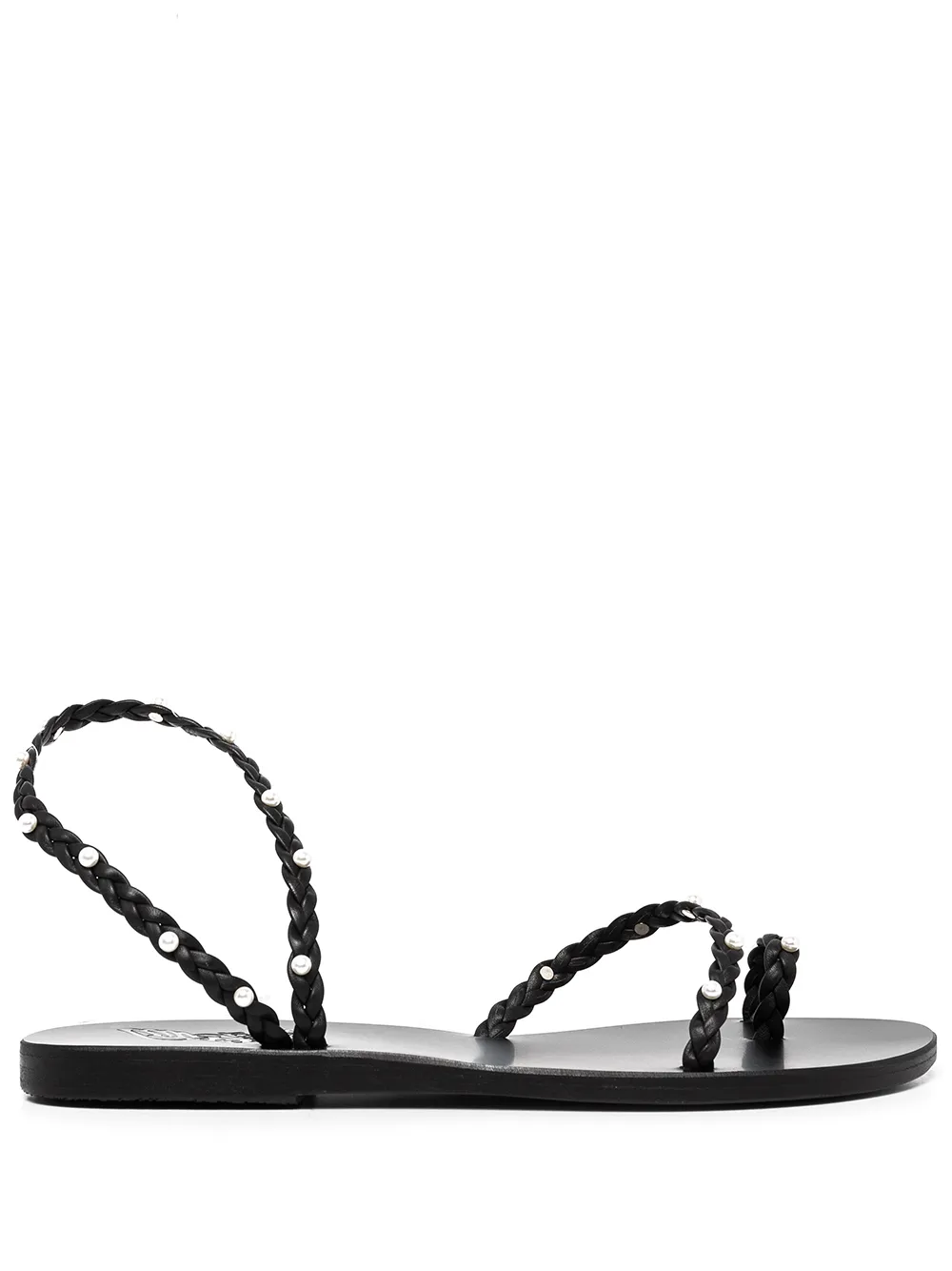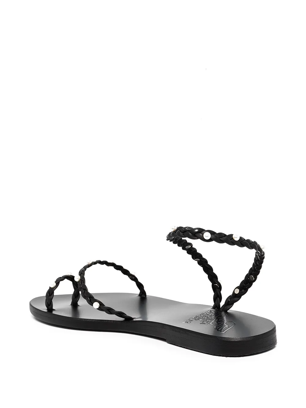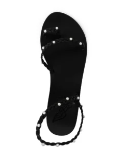 Black leather Eleftheria pearl-embellished sandals from ANCIENT GREEK SANDALS featuring pearl detail, braided strap, single toe strap and ankle strap.