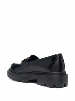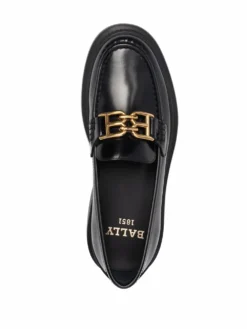 Black leather logo-charm leather loafers from BALLY featuring gold-tone logo lettering, slip-on style, chunky rubber sole, polished finish and round toe.