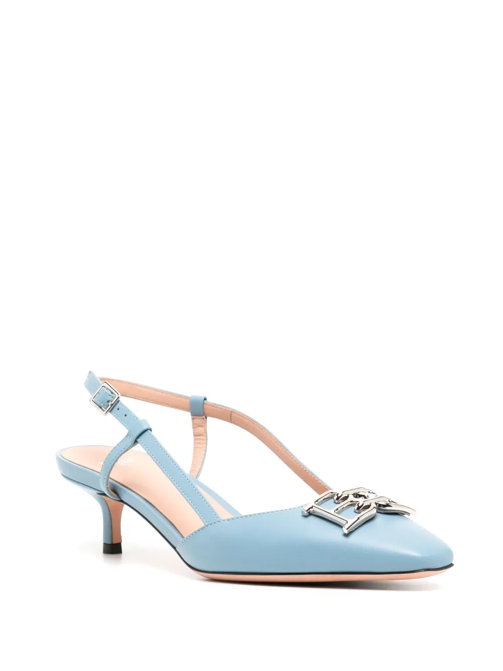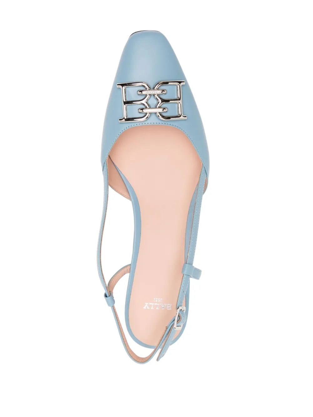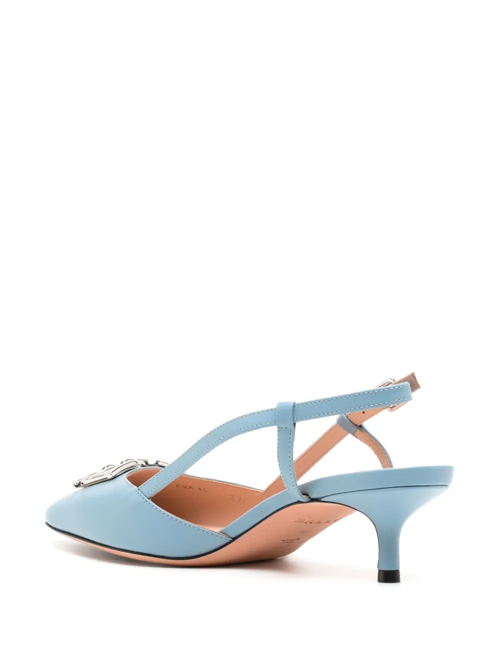 logo-plaque leather pumps from BALLY featuring duck egg blue, leather, silver-tone logo plaque, pointed toe, buckle-fastening slingback strap and low heel.
