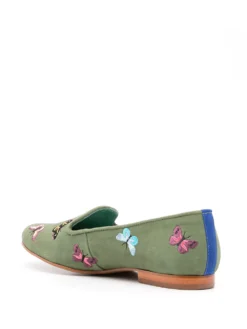 Green suede butterfly-detail loafers from BLUE BIRD SHOES featuring butterfly print, slip-on style, branded insole and rubber sole.