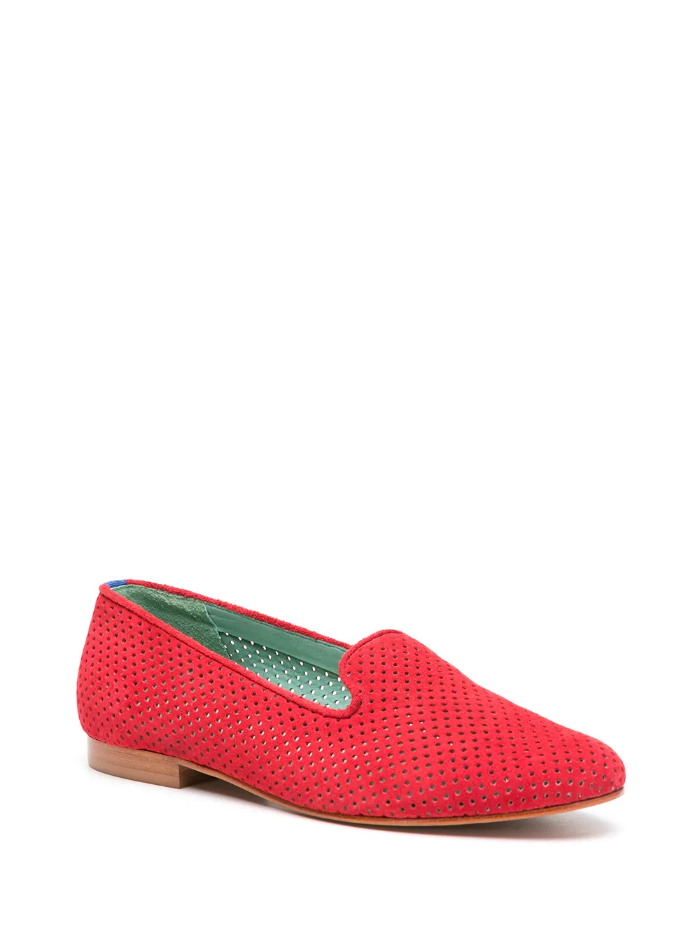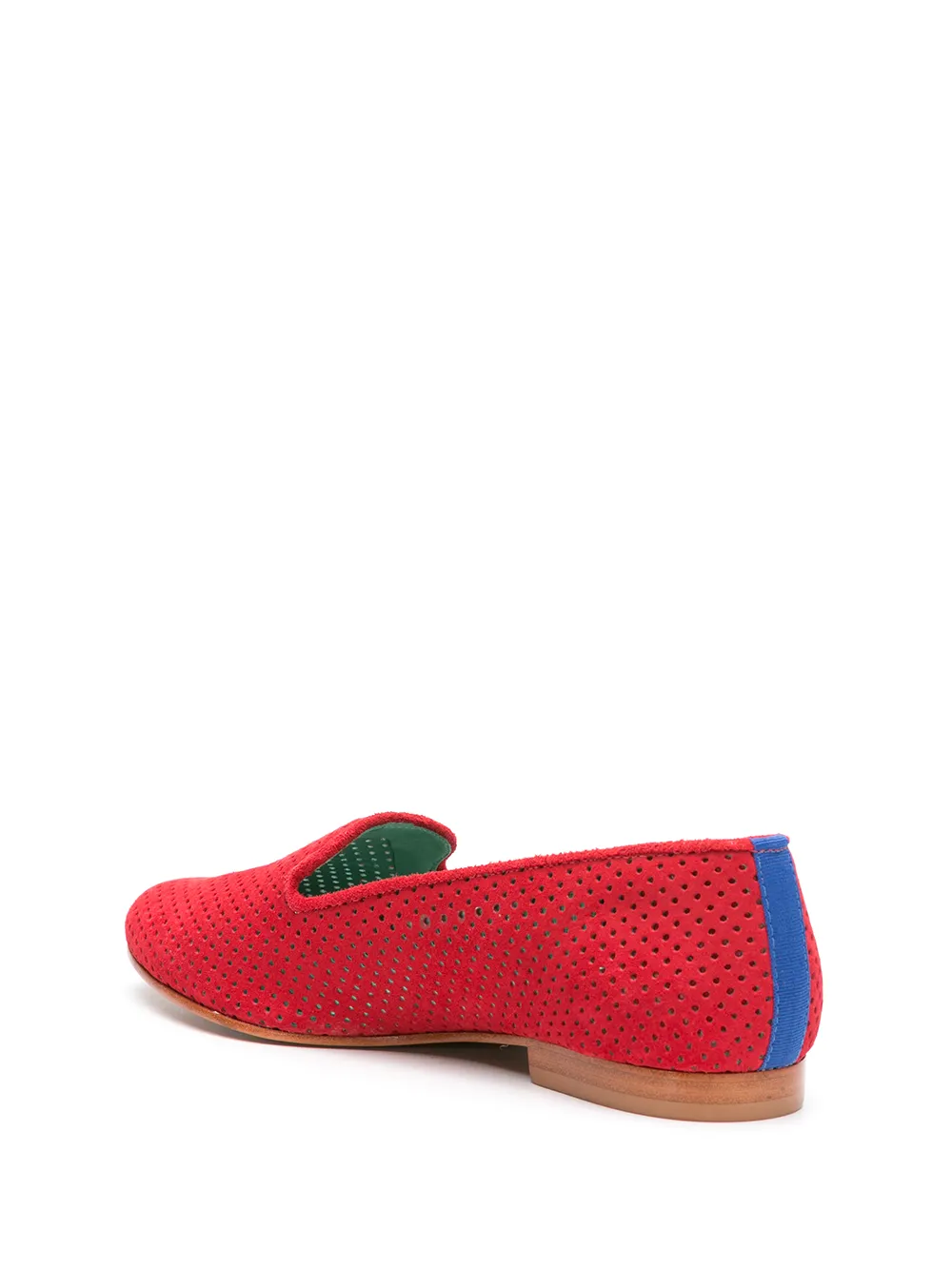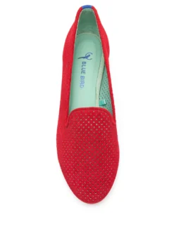 Red sude/leather perforated design loafers from BLUE BIRD SHOES featuring perforated design, almond toe, slip-on style, branded insole and flat sole.