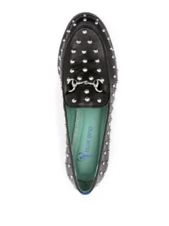 Jet-black leather studded leather loafers from BLUE BIRD SHOES featuring stud detailing, almond toe, low heel and silver-tone hardware.