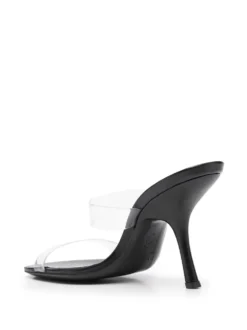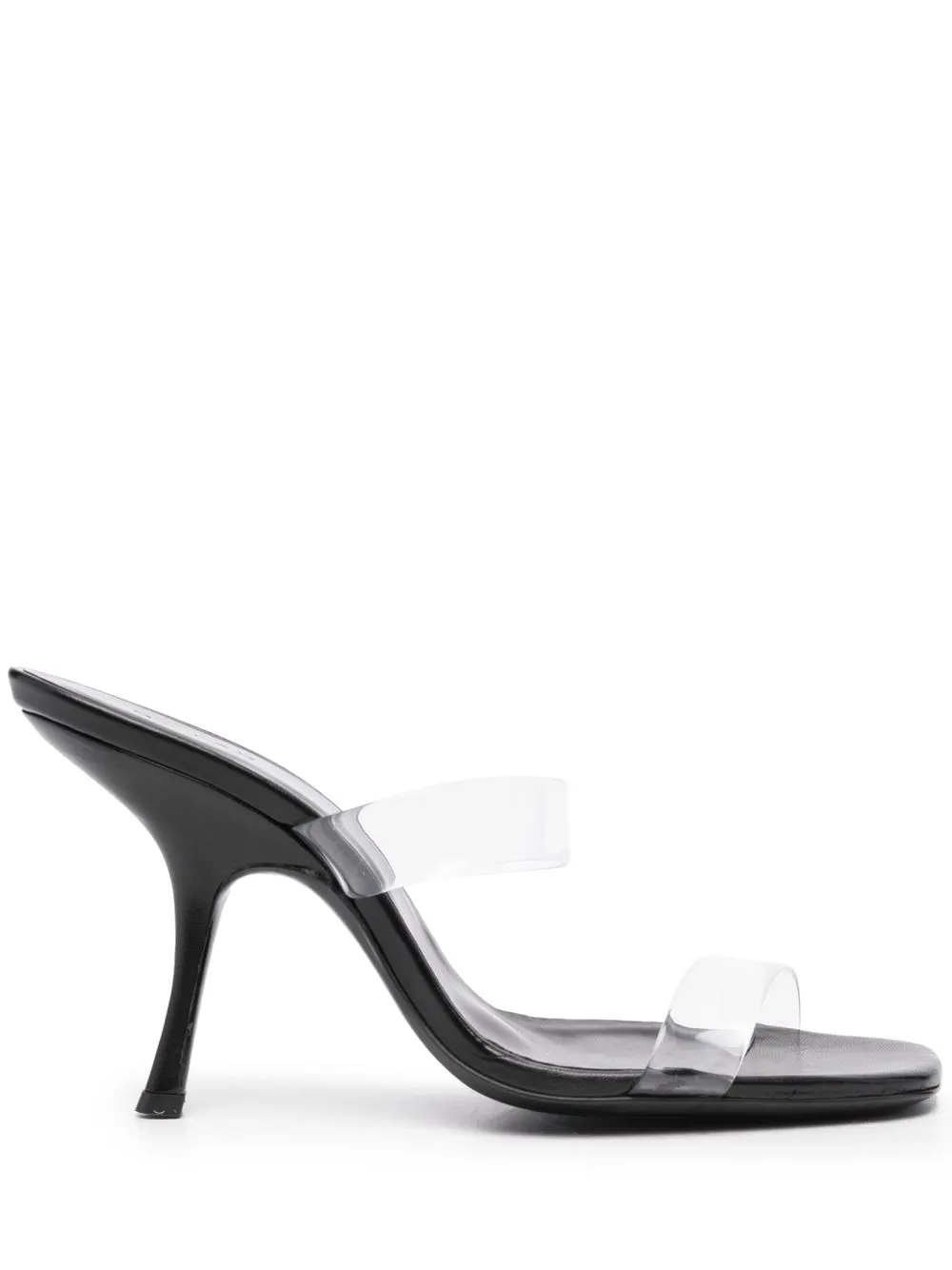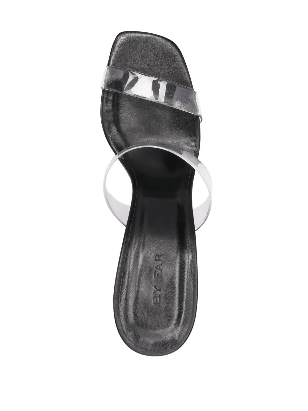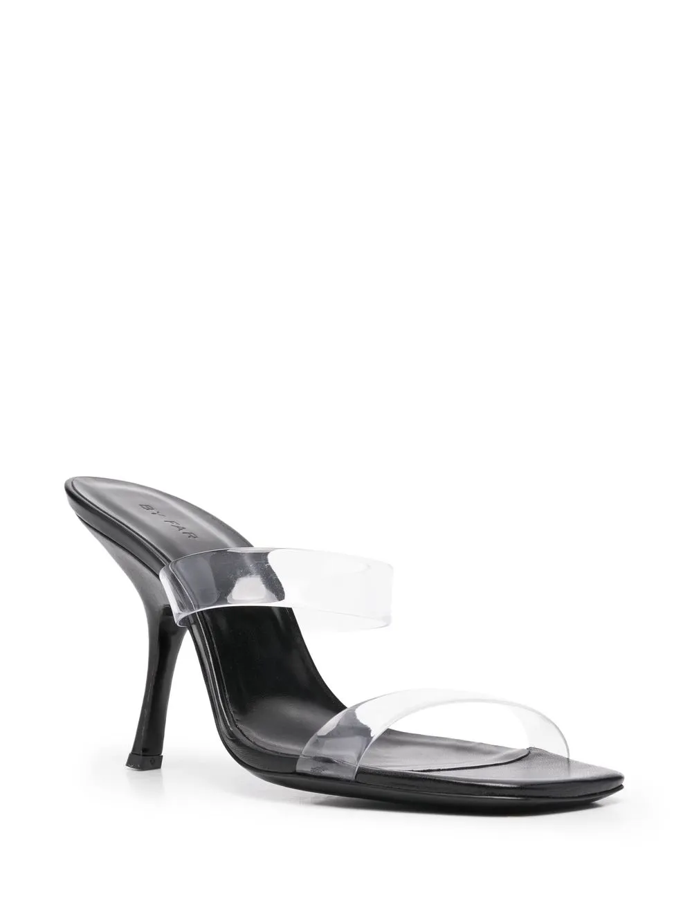 Clara 90mm double-strap sandals from BY FAR featuring jet black, leather, double-strap design, open toe, high sculpted heel and slip-on style.