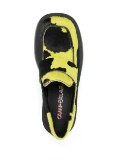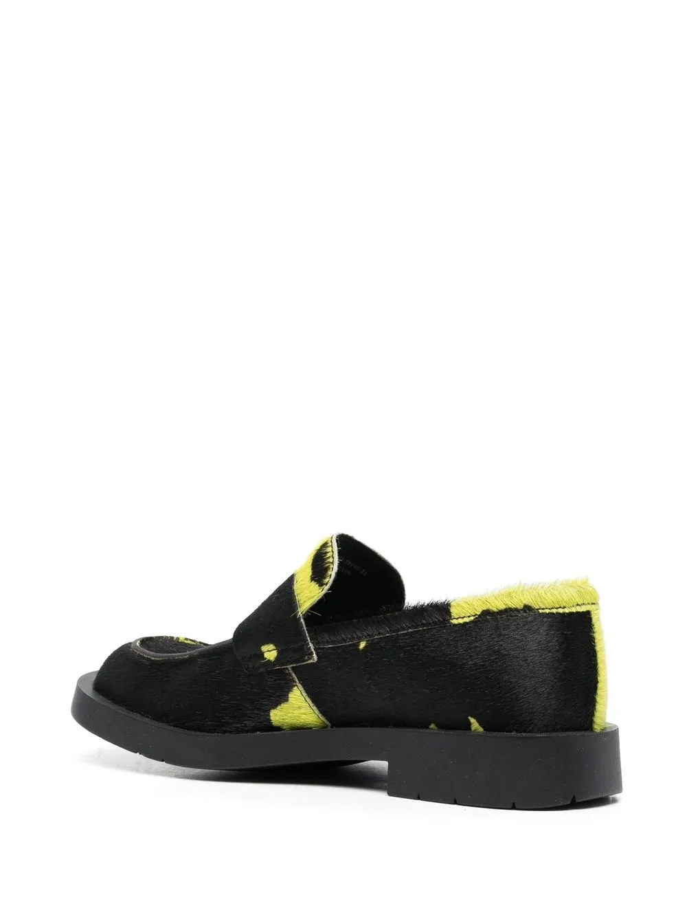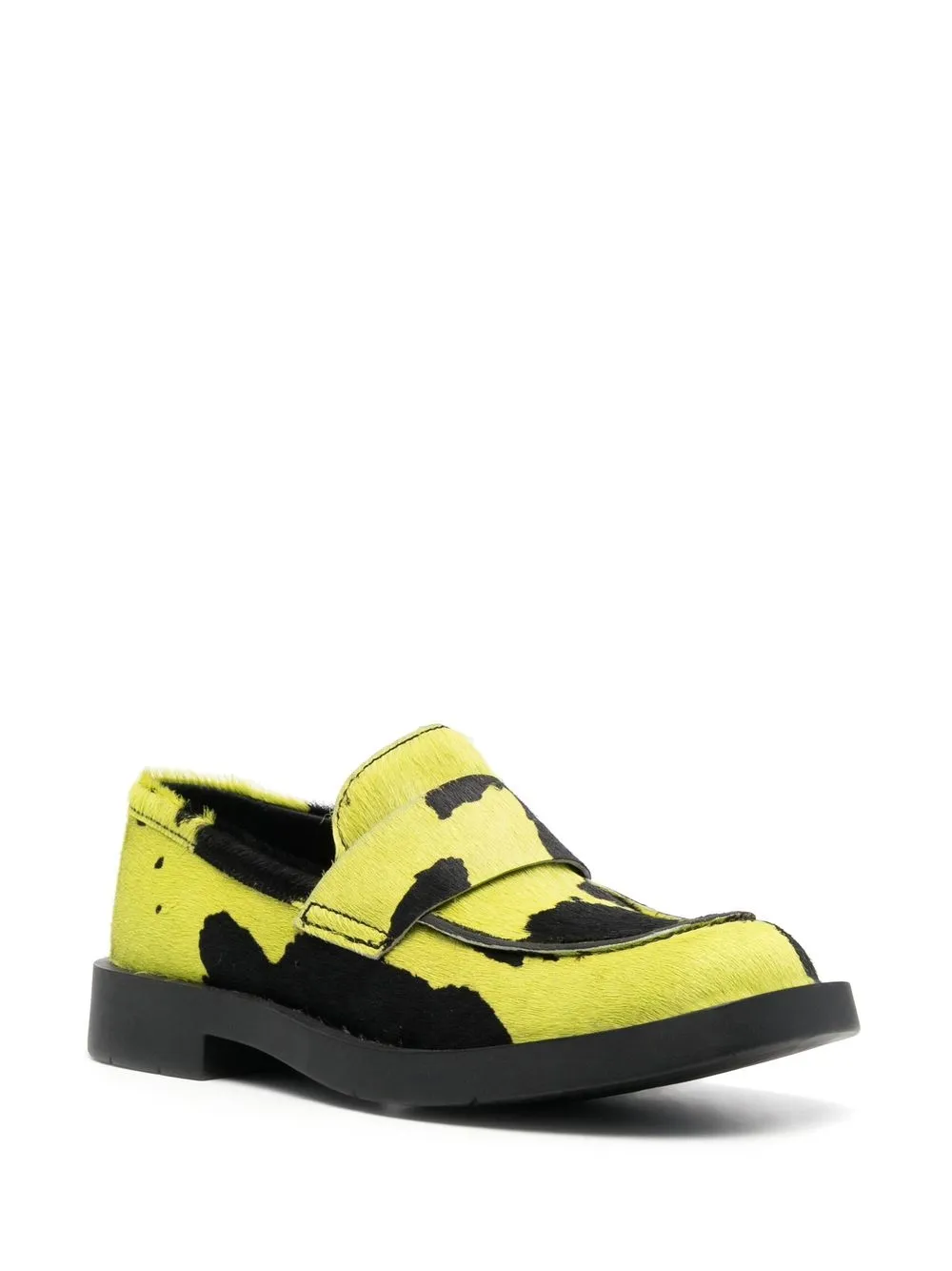 animal-print leather loafers from CamperLab featuring black, fluorescent yellow, leather, animal pattern, round toe, branded insole and flat sole. Conscious: This item is crafted with leather that has been produced in a certified Leather Working Group (LWG) or ICEC tannery, ensuring the production process has a reduced environmental impact..