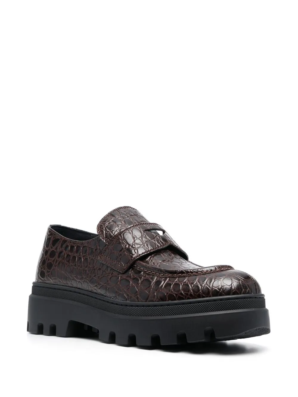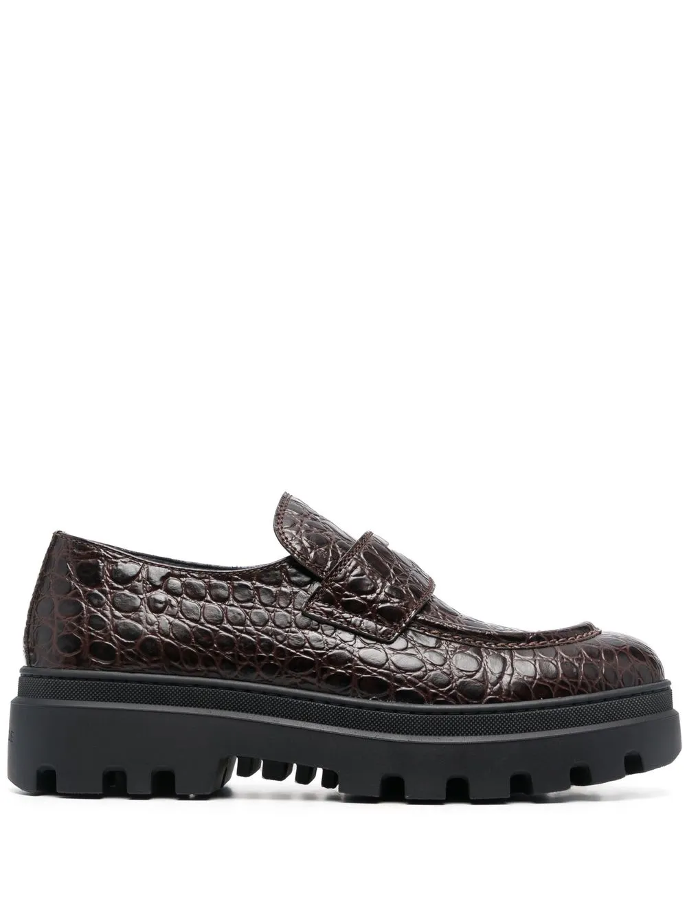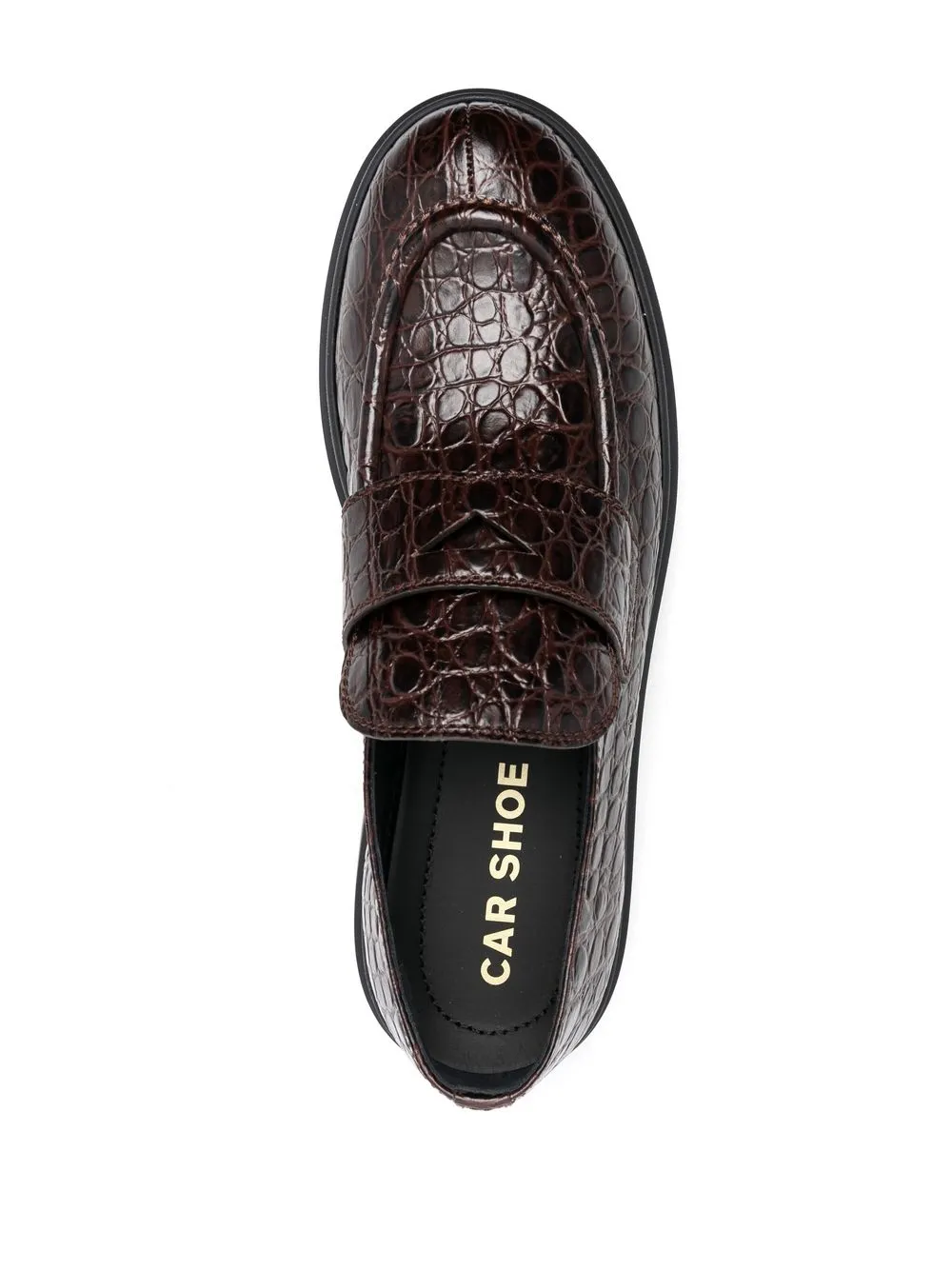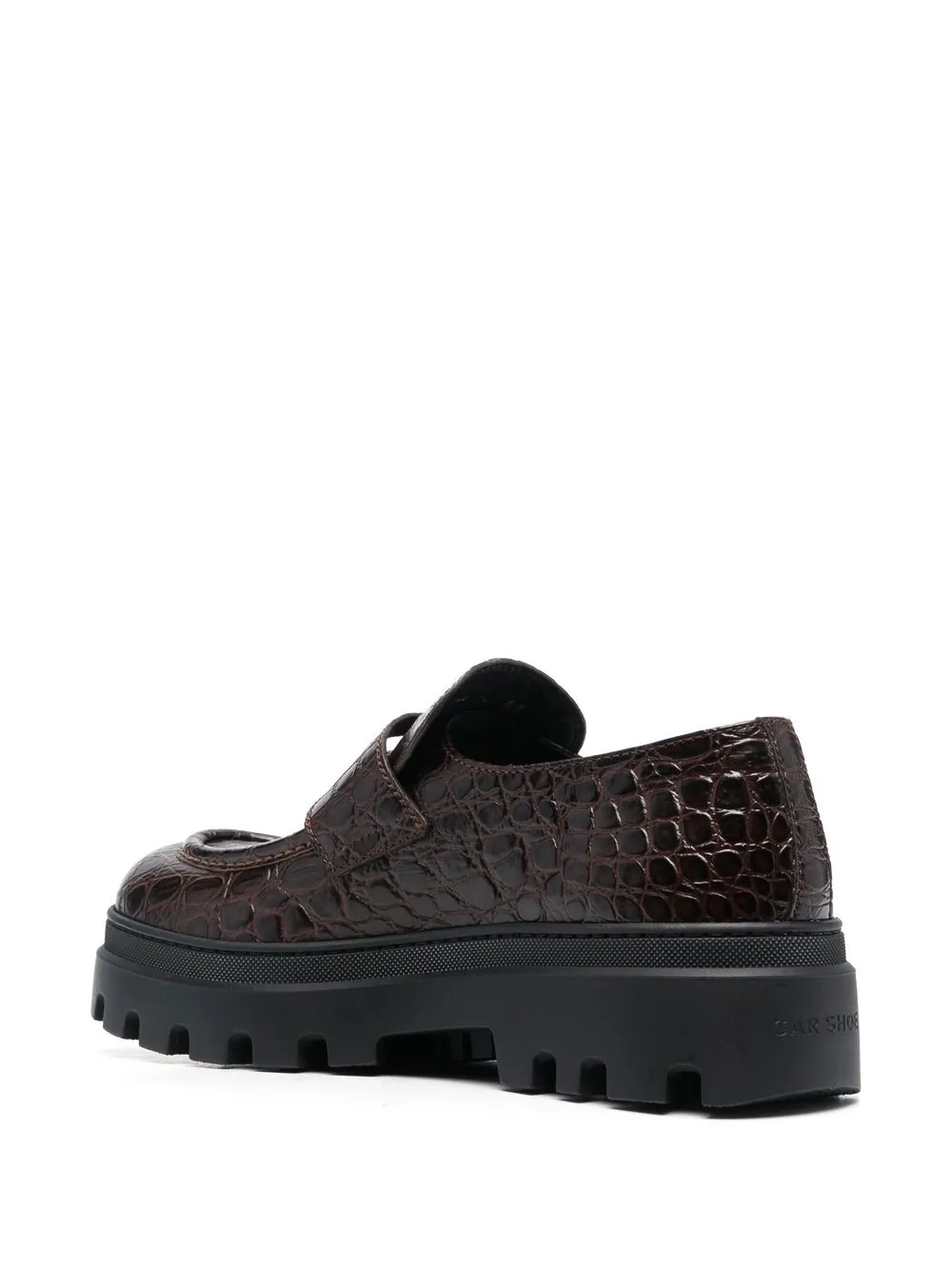 embossed crocodile effect loafers from CAR SHOE featuring embossed crocodile effect, crossover strap detail, slip-on style, round toe, rubber lug sole, branded insole, brown and calf leather.
