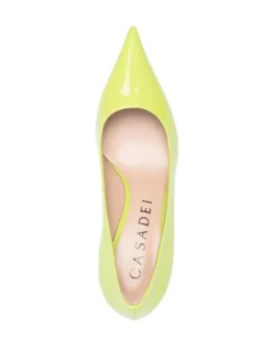 Vibrant hues, high-octane detailing and patent finishes take centre stage at Casadei for SS23, as evidenced by these leather pumps. Riffing on a classic silhouette, they’re presented in a vibrant lime-green shade that emphasises the bold mood.