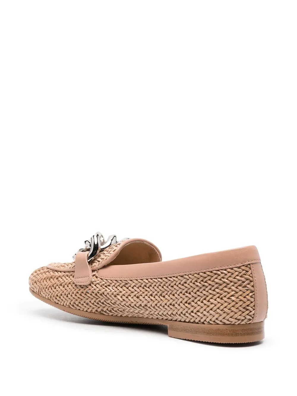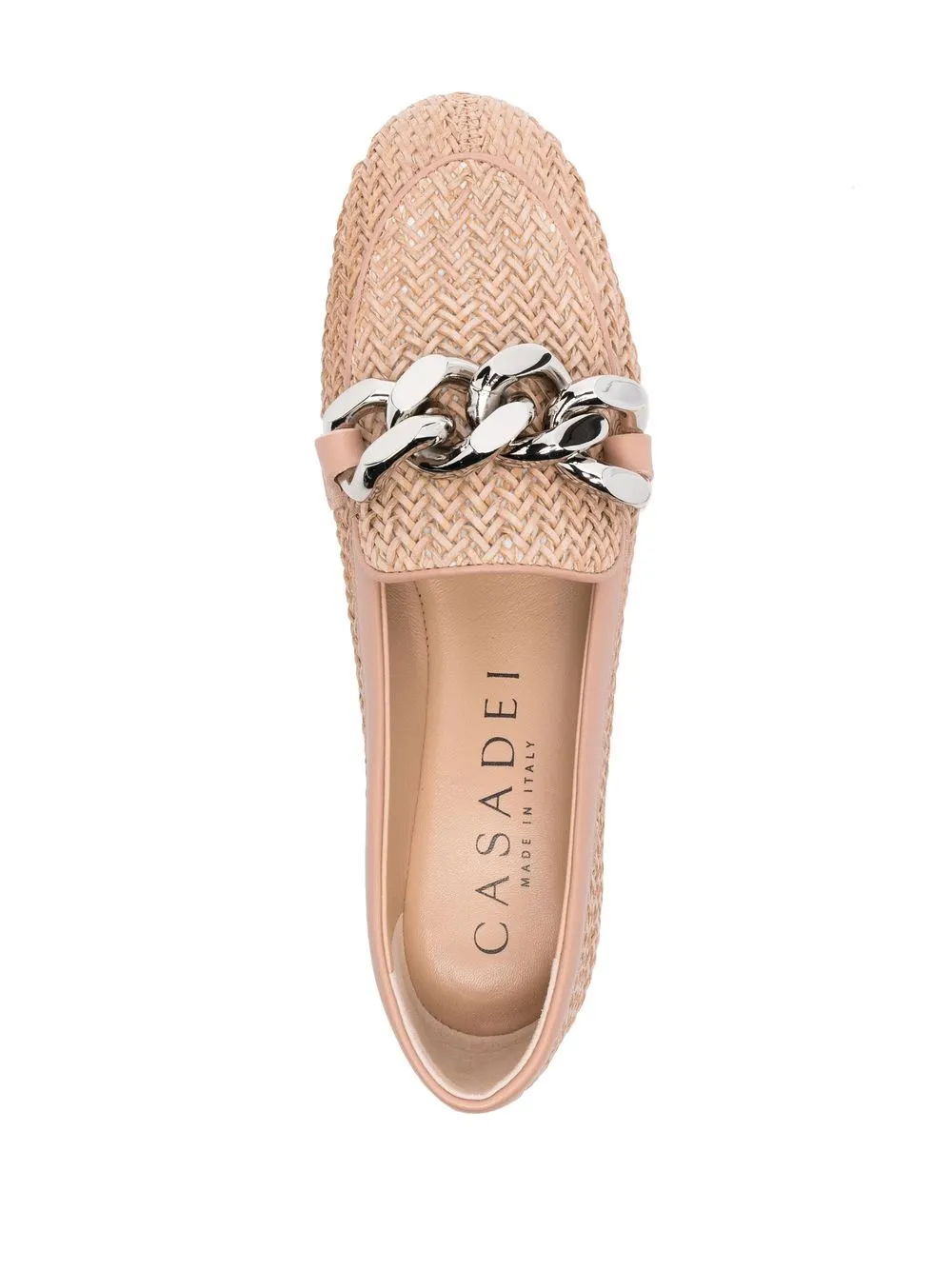 Beige chain-link woven loafers from CASADEI featuring interwoven design, chain-link detailing, round toe and flat sole.