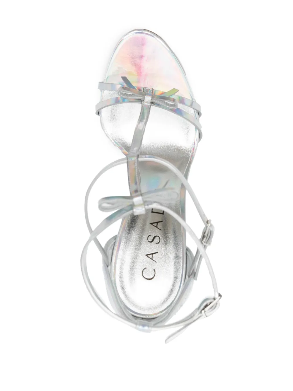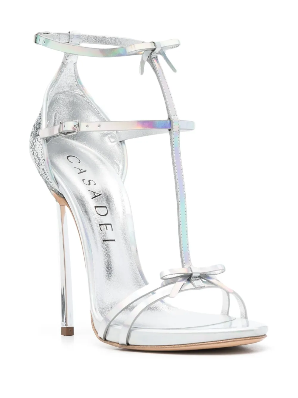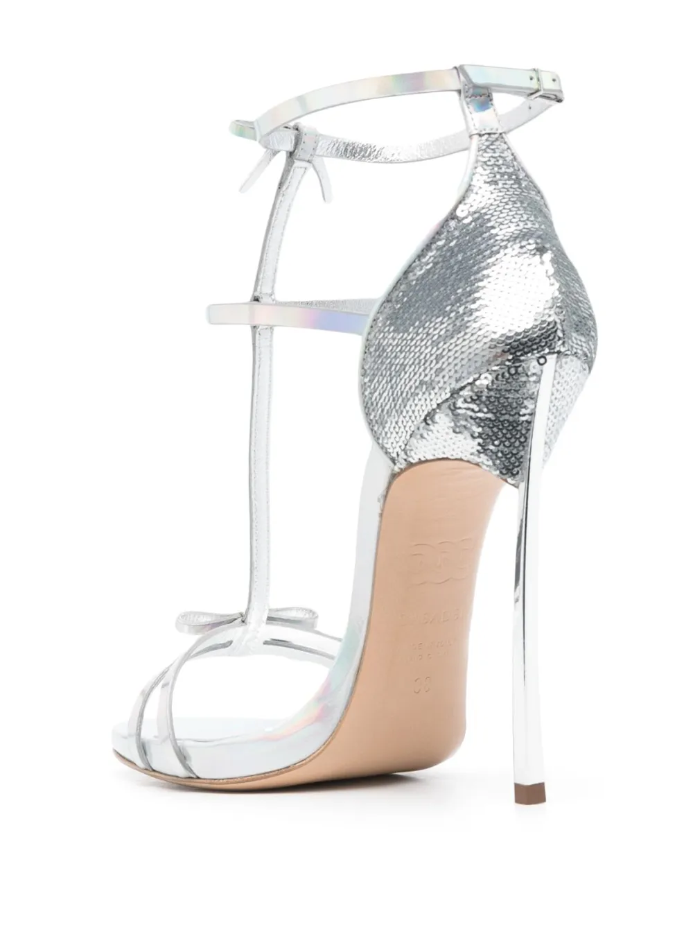 crystal-embellished 115mm heel sandals from CASADEI featuring silver-tone, calf leather, crystal embellishment, multi-way straps, bow detailing, open toe, buckle-fastening ankle strap, branded leather insole and leather sole.