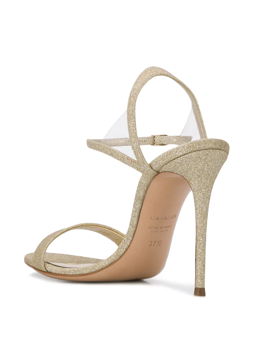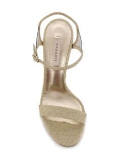 Gold leather glittered 110mm sandals from Casadei featuring a high heel, an ankle strap with a side buckle fastening, a branded rear patch and an open toe.