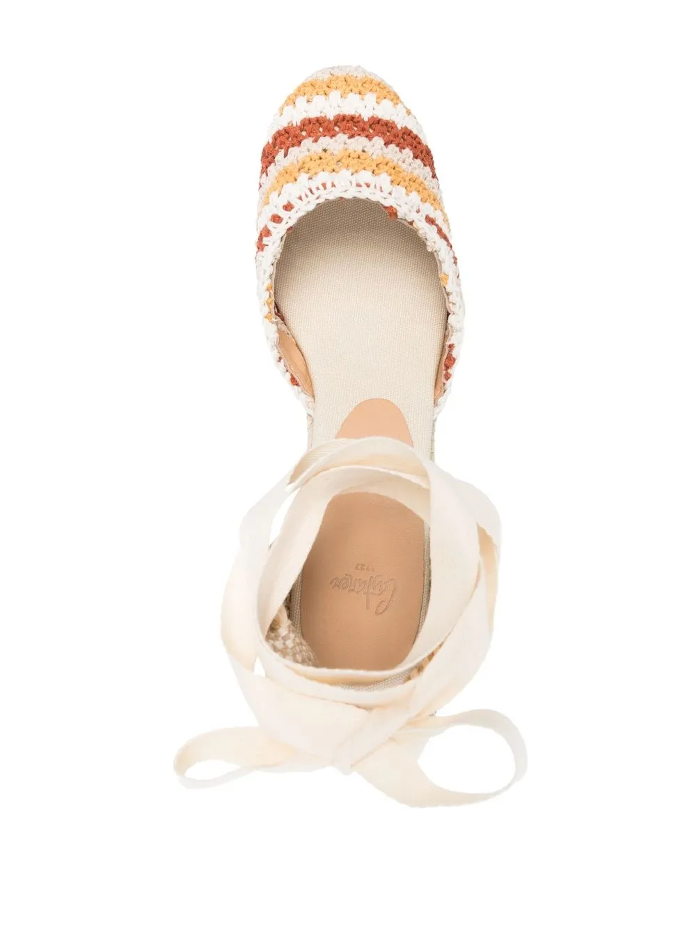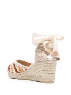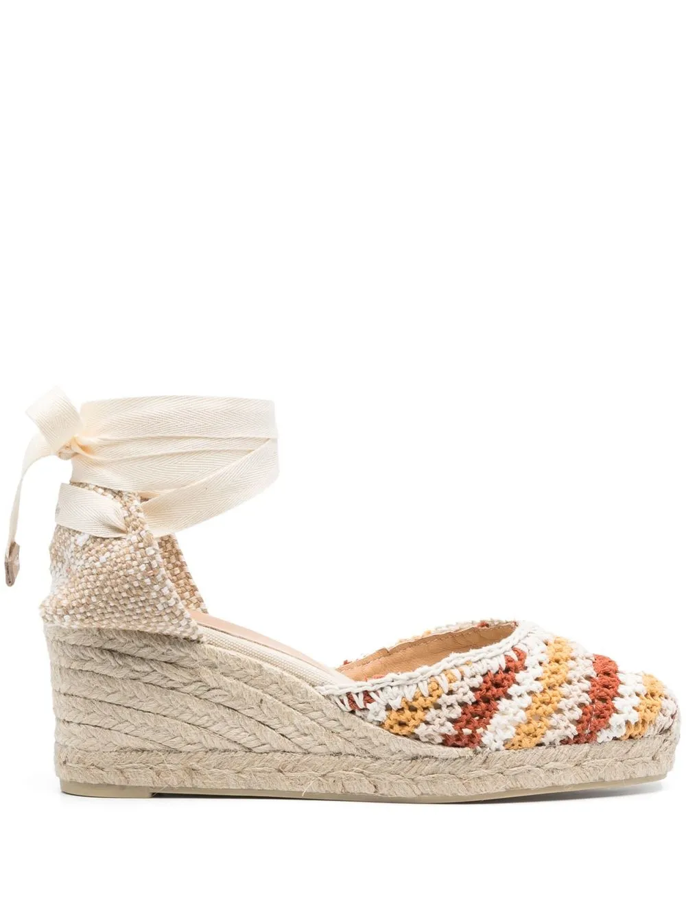 Carina 95mm crochet wedge sandals from Castañer featuring beige, multicolour, calf leather, crochet knit, almond toe, tie-fastening ankle strap and 95mm high wedge heel.