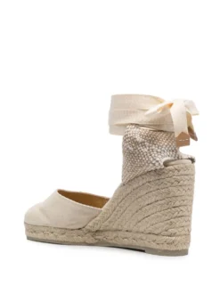 Cream Carina canvas wedge espadrilles from Castañer featuring almond toe, wraparound style, self-tie fastening, branded insole and braided raffia wedge heel.