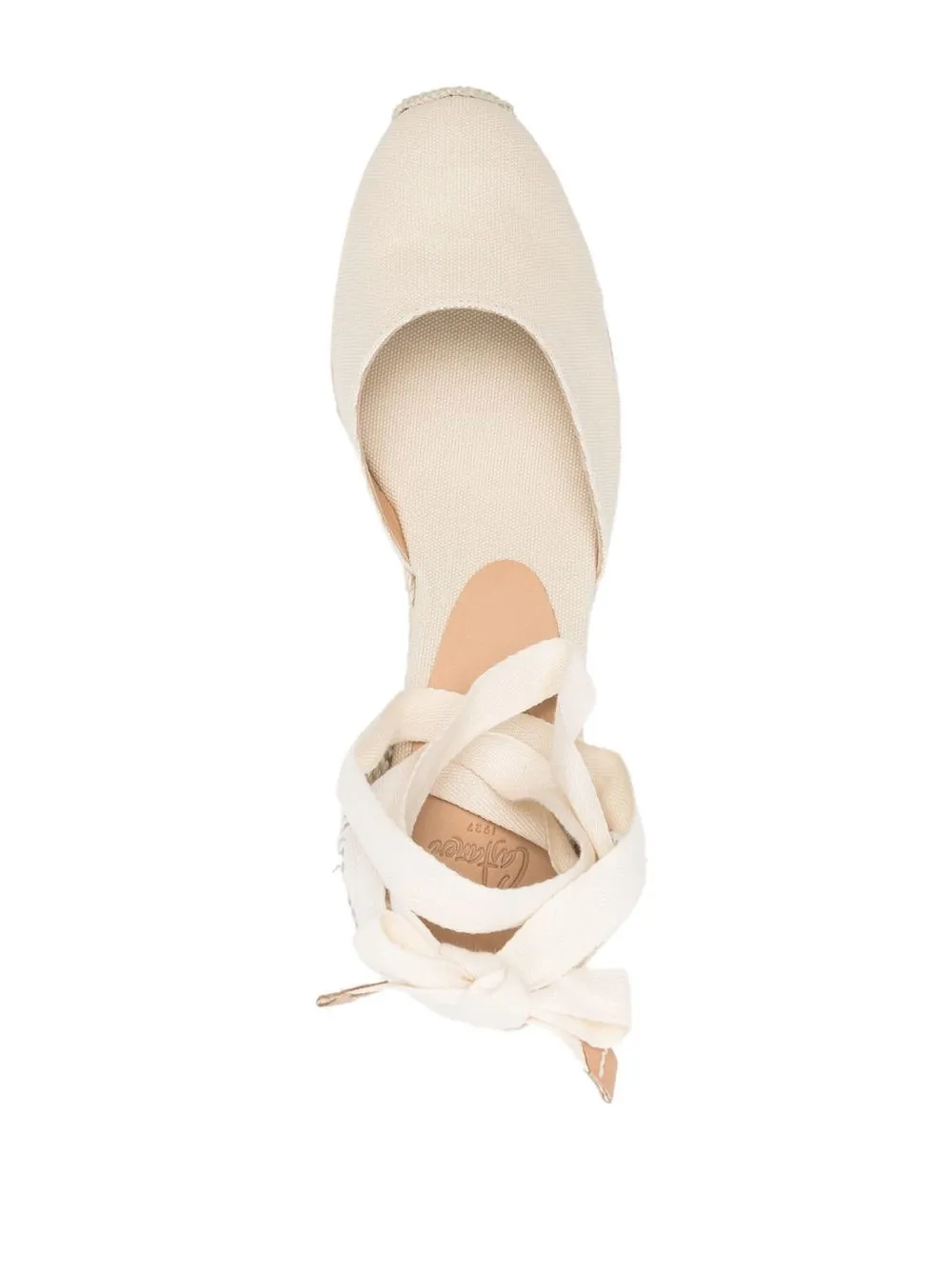 Castañer workshop industrialized the famous Spanish espadrille thanks to the ingenuity of its founders: Luís Castañer and his cousin Tomás Serra. An iconic style, the Carina wedge sandals are crafted from cotton canvas, in a beige shade, and are completed by a braided fabric heel strap for the perfect fit.