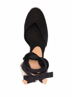 Black leather/fabric Chiara 110mm wedge espadrilles from CASTAÑER featuring round toe, tie-fastening ankle strap, branded insole and high wedge heel.