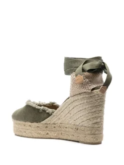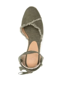 Clarina wedge espadrilles from Castañer featuring olive green, cotton, calf leather, frayed detailing, round toe, tie-fastening ankle strap, branded insole, braided raffia wedge heel and beige/ecru.