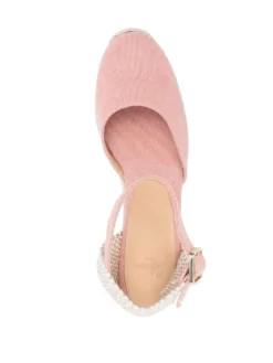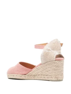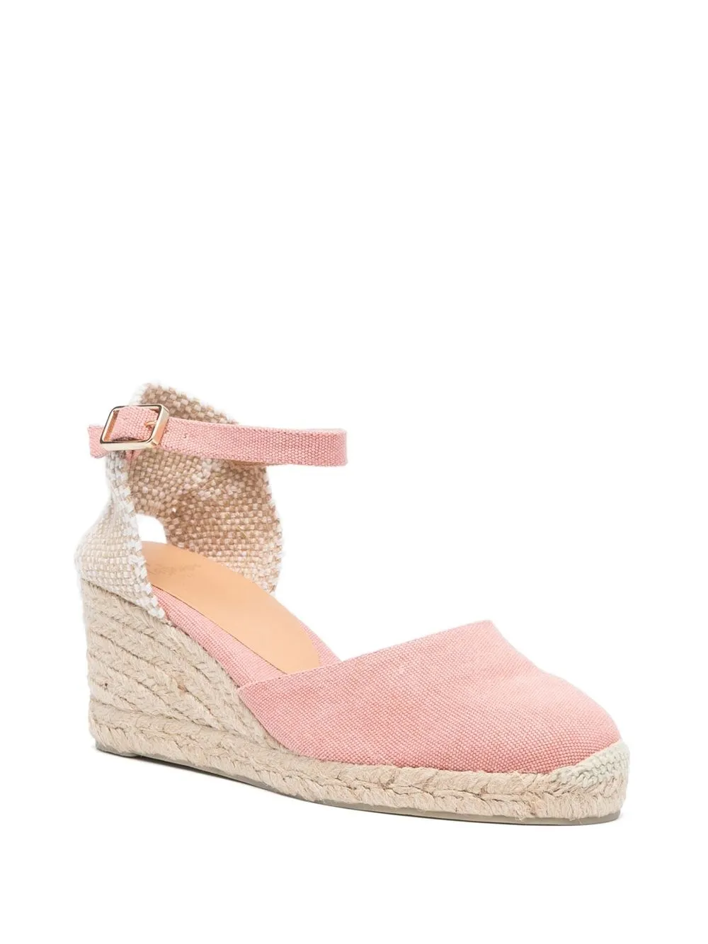 leather heeled 70mm espadrilles from Castañer featuring pink, calf leather, textured finish, round toe, buckle-fastening ankle strap, braided raffia wedge heel and high heel.