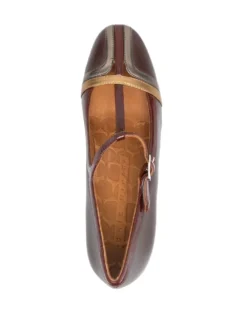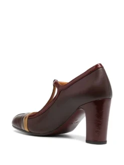Mary Jane side-buckle pumps from CHIE MIHARA featuring brown, calf leather, T-bar strap, side buckle fastening, round toe and high block heel.