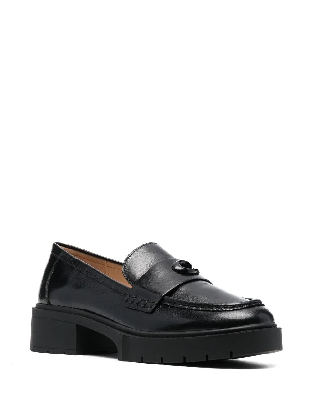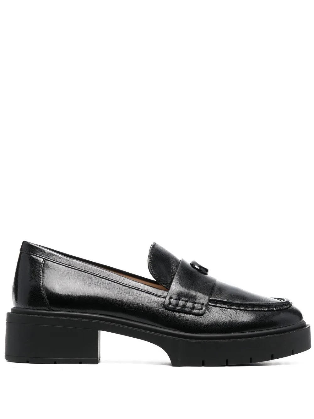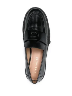 Leah chunky sole leather loafers from COACH featuring jet black, calf leather, logo lettering, almond toe, branded leather insole and low block heel.