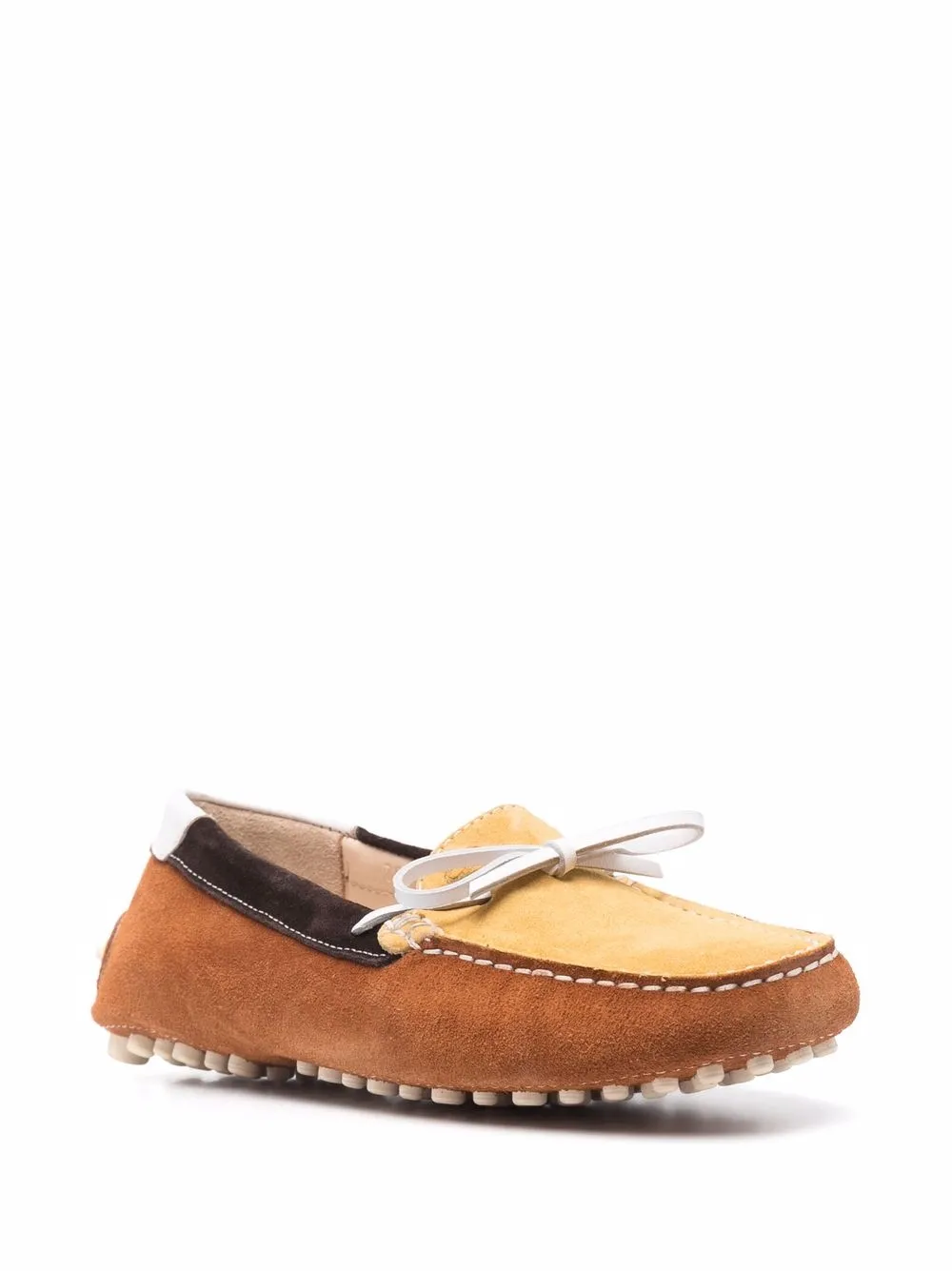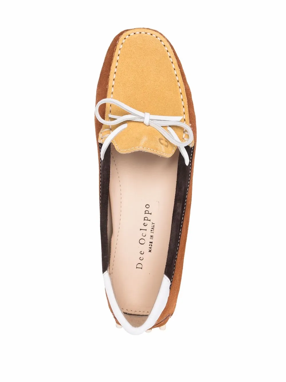 Multicolour suede colour-block driving loafers from Dee Ocleppo featuring colour-block panelled design, round toe, bow detailing, branded insole, slip-on style and pebbled sole.