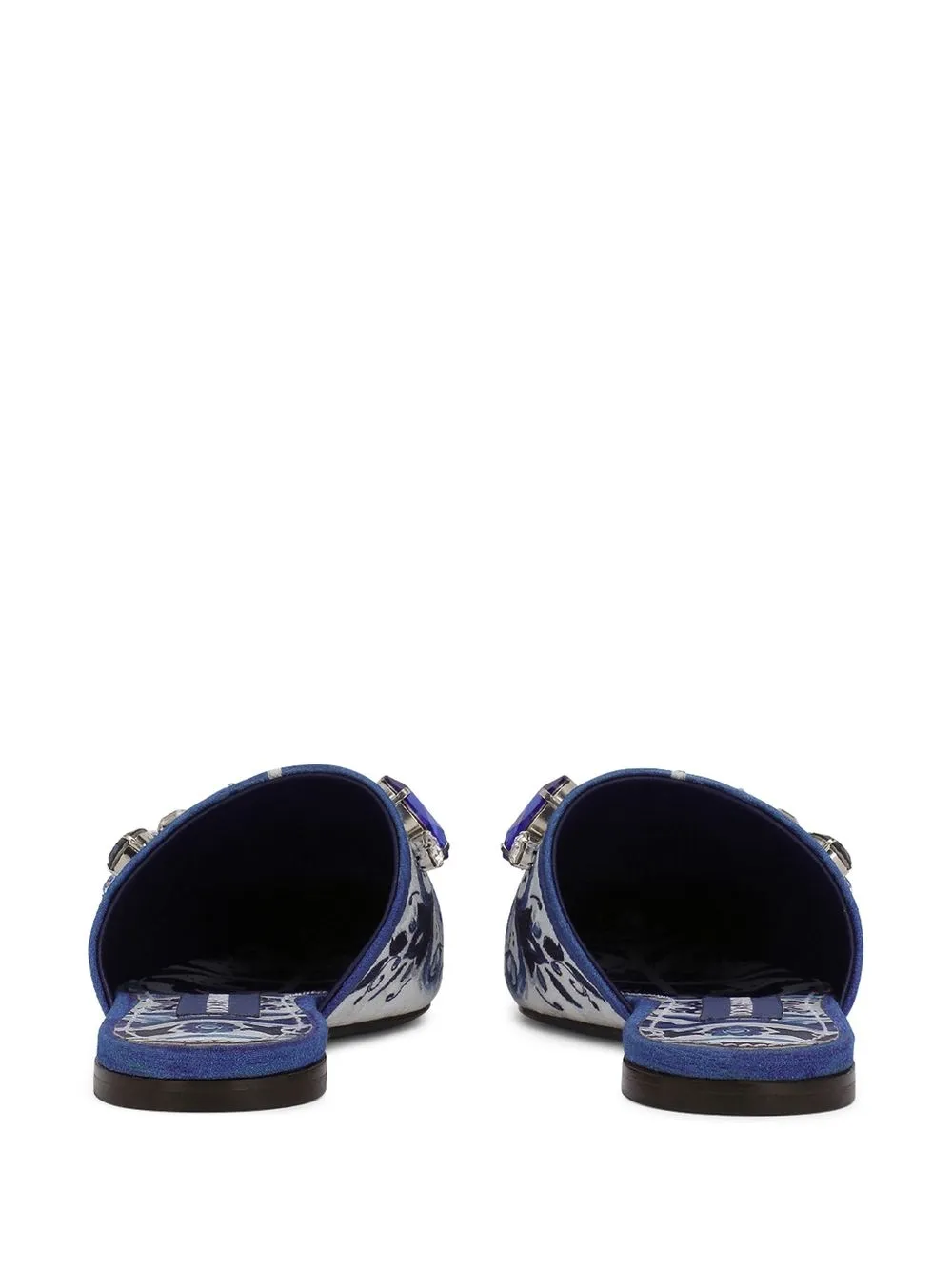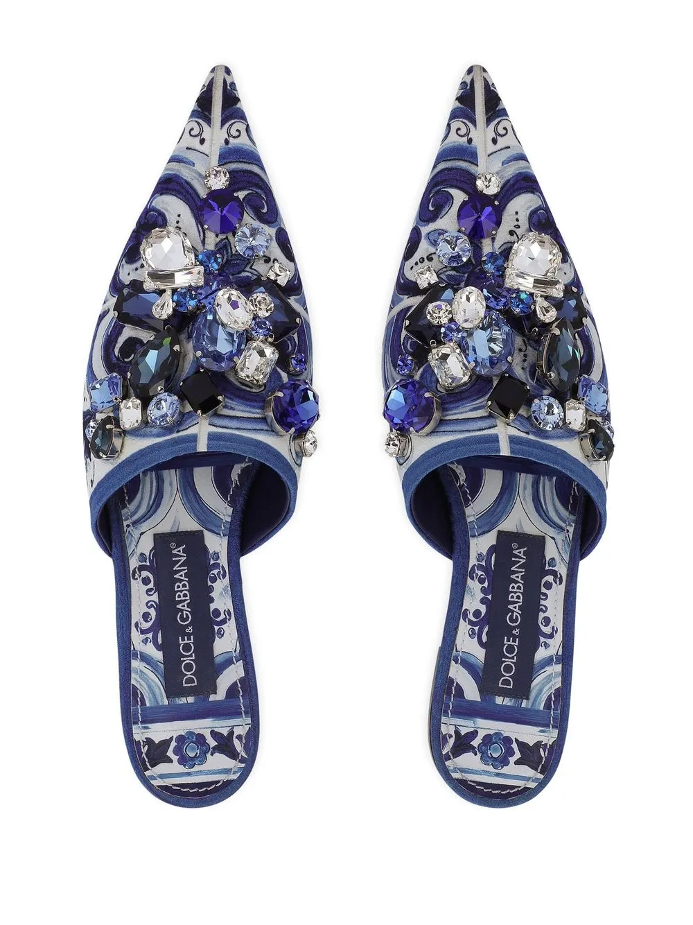 embellished jacquard slippers from DOLCE & GABBANA featuring sapphire blue, leather, cotton blend, all-over graphic print, crystal embellishment, pointed toe and open back.