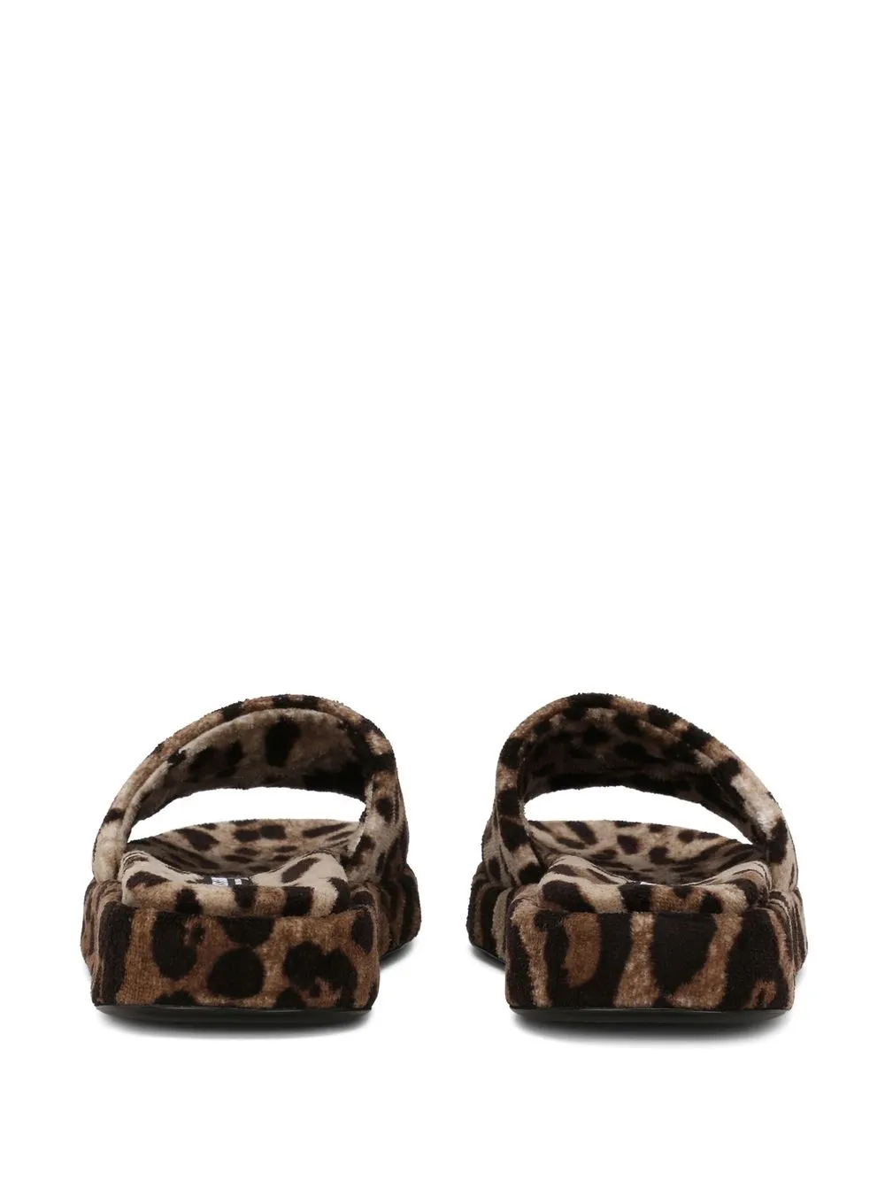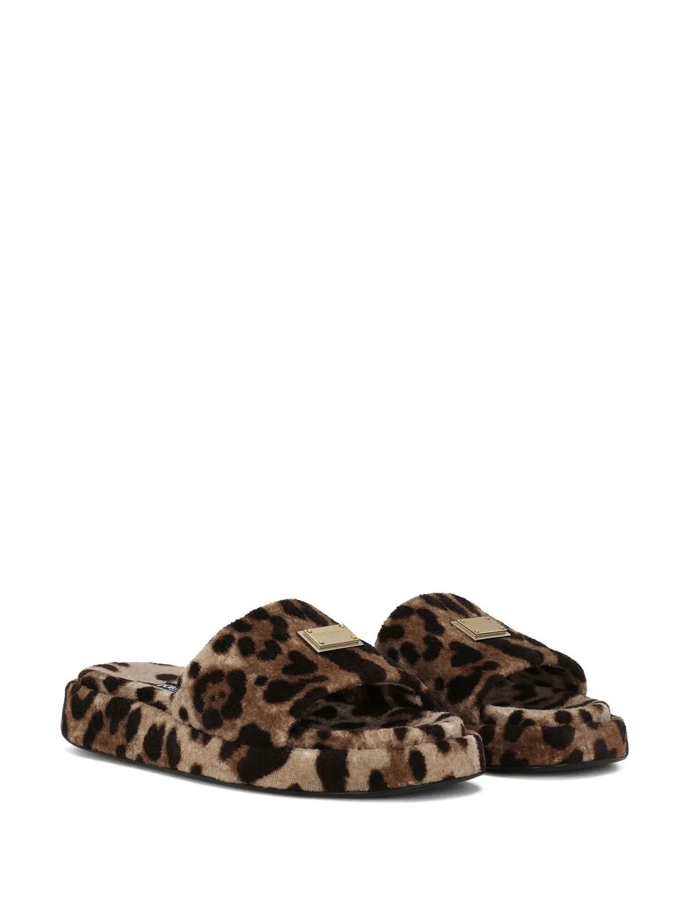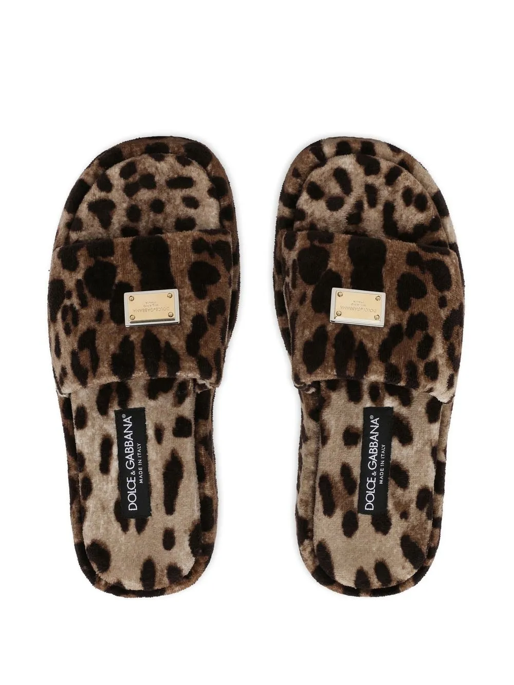 leopard-print fleece slippers from DOLCE & GABBANA featuring brown, cotton, fleece texture, leopard print, gold-tone logo plaque, single toe strap, open toe and branded footbed.