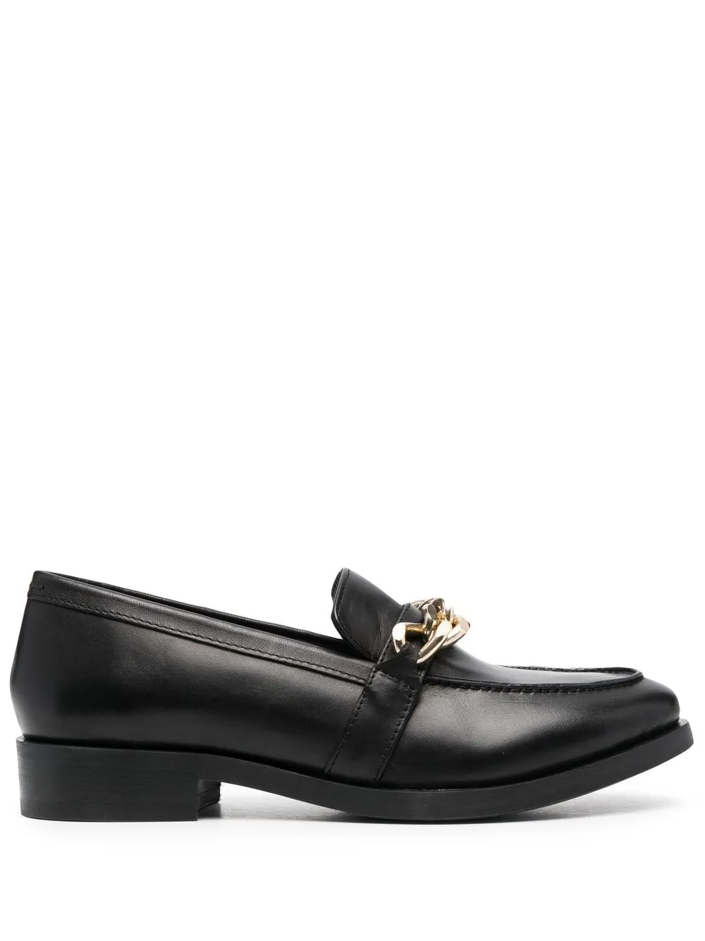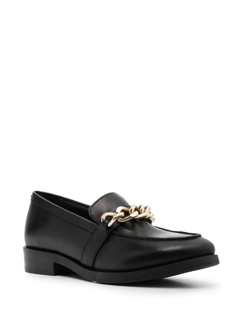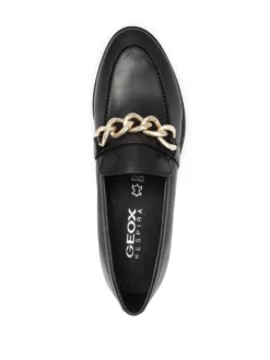 Donna chain-detail loafers from Geox featuring black, leather, smooth grain, gold-tone hardware, chain-link detailing, branded insole, round toe, flat rubber sole and slip-on style.