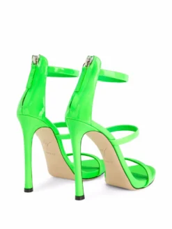 Green patent leather Harmony patent leather sandals from Giuseppe Zanotti featuring double-strap design, open toe, branded leather insole, rear zip fastening and high stiletto heel.
