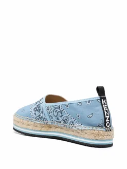 Blue/white/black bandana platfrom espadrilles from KENZO featuring bandana print, logo pull-tab at the heel, branded footbed, round toe, slip-on style, platform sole and jute sole.