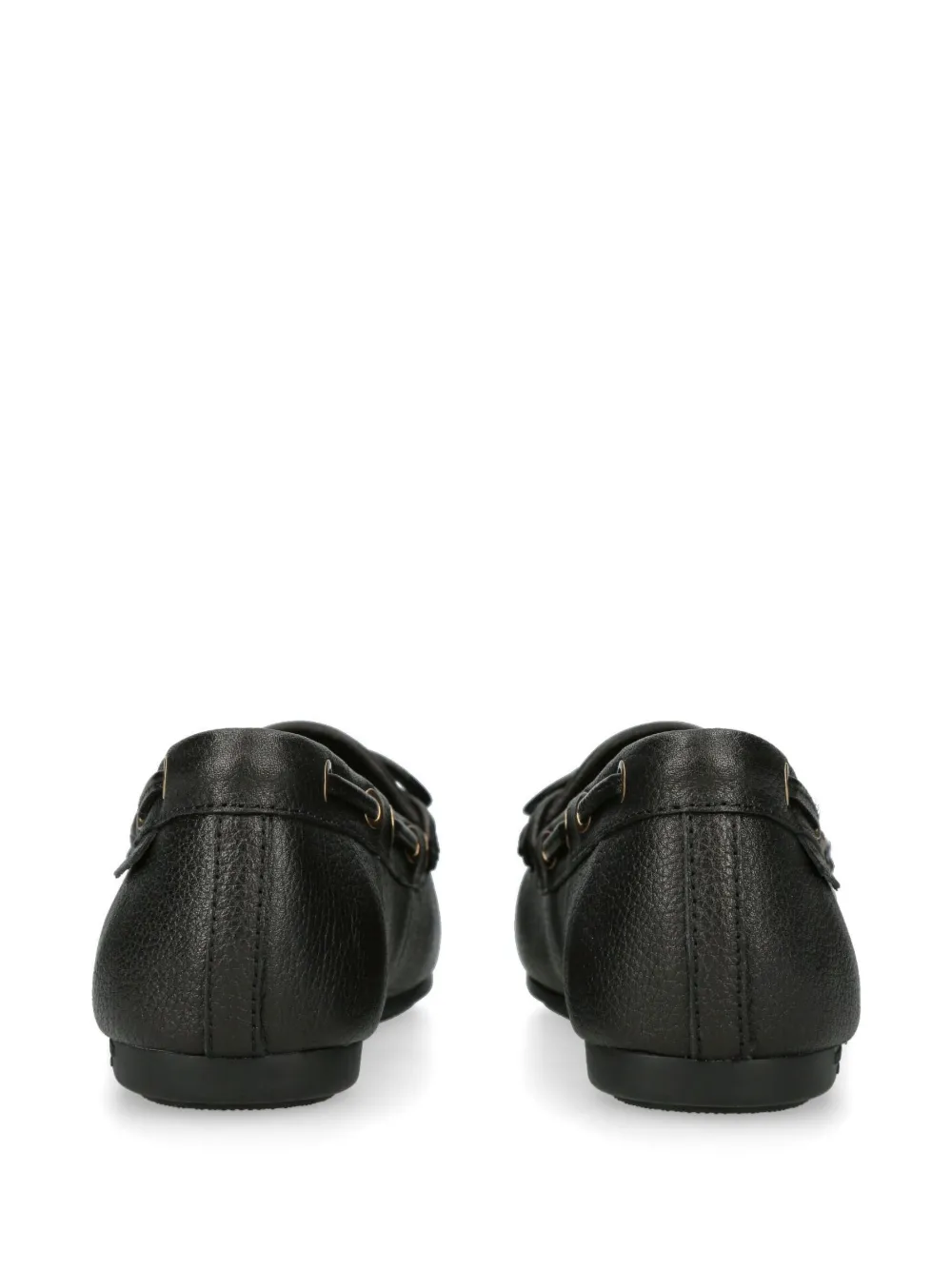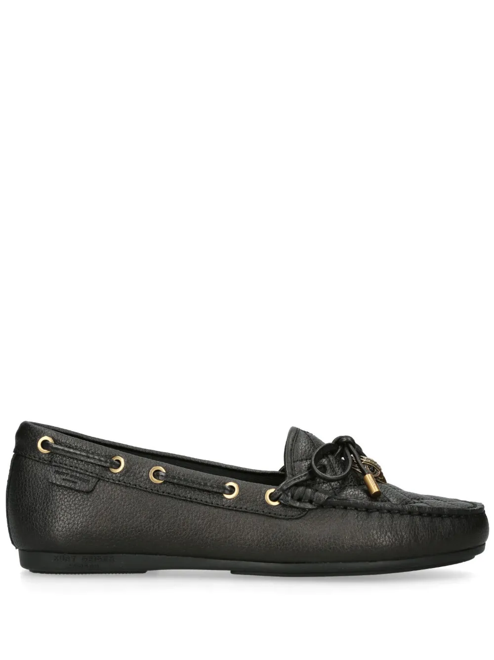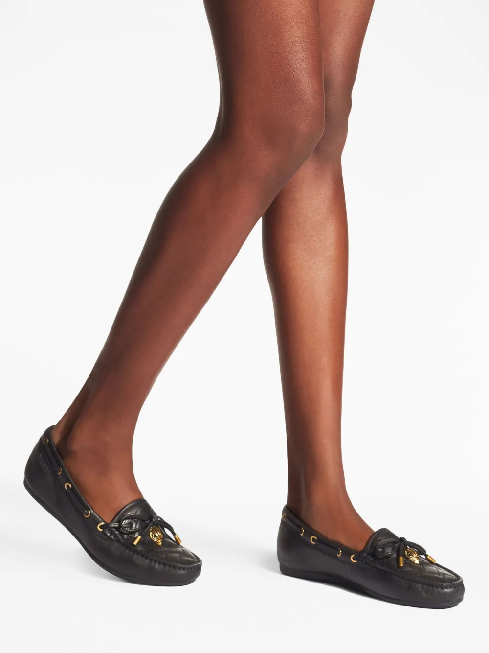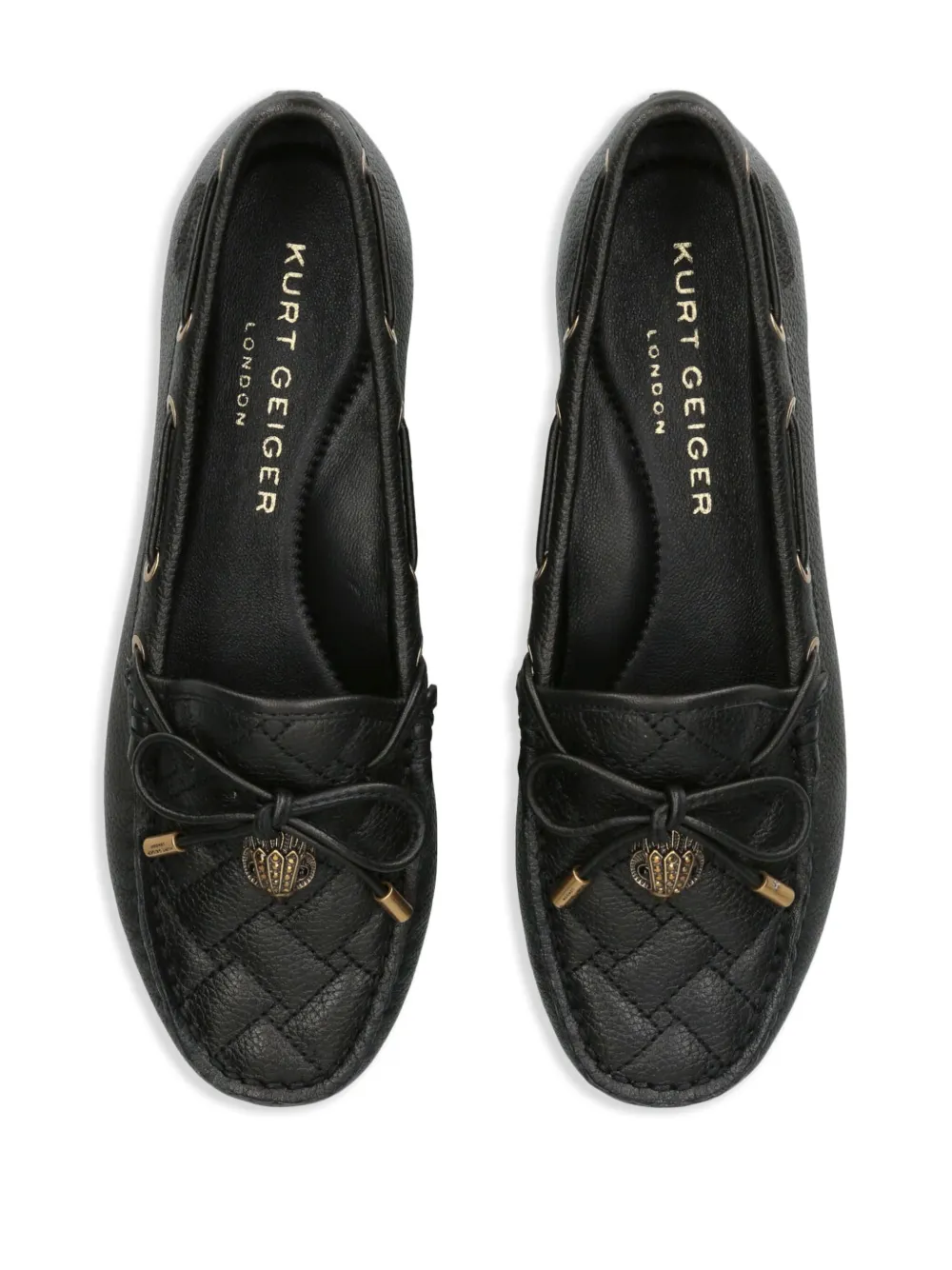 The Eagle moccasins by Kurt Geiger London are a sober option that highlights iconic brand details. Crafted from grained leather in an all-black hue, the shoe features overstitch quilting at the vamp. Gold-tone metal eyelets run along the side of the shoe, through which laces are fed, tying at the front. To the centre lies the brand signature that gives this style its name – the eagle head charm.