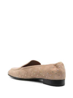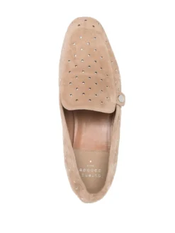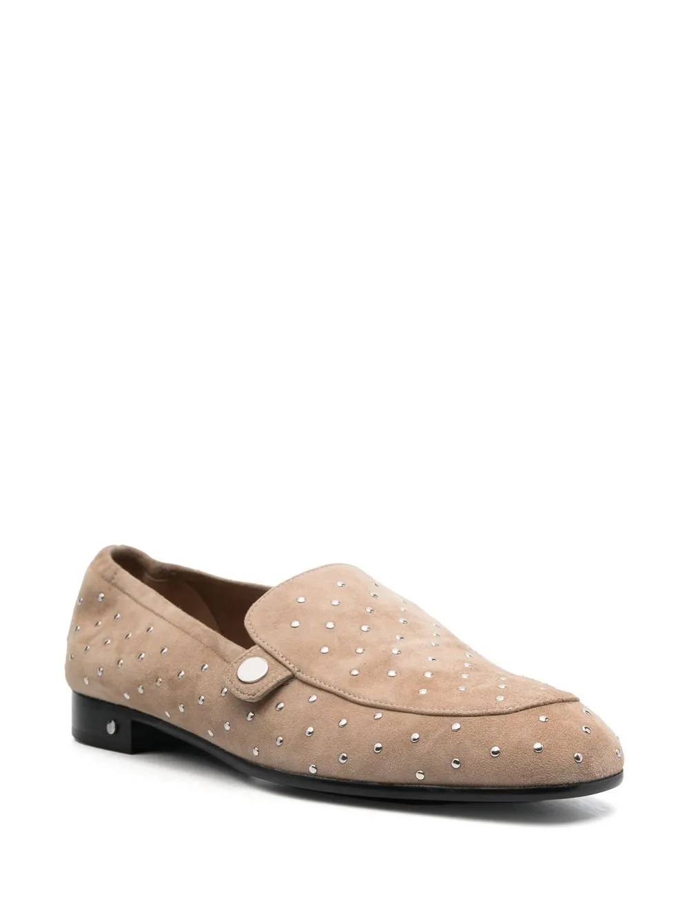 rhinestone-embellished suede loafers from LAURENCE DACADE featuring blush beige, calf suede, rhinestone embellishment, almond toe, side button fastening, slip-on style, branded leather insole and flat sole.