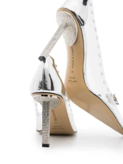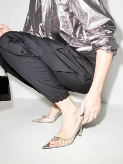 Georgian footwear brand MACH & MACH creates eye-catching silhouettes for statement looks. Crafted from leather, the Diamond Dreams pumps are adorned with glistening crystals on their pointed toe and along their transparent upper. They sit atop a bedazzled stiletto heel and feature a contrasting metallic heel counter.