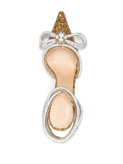 Double Bow glitter pumps from MACH & MACH featuring gold-tone, calf leather, pointed toe, bow detailing, glitter detailing, crystal embellishment, buckle-fastening ankle strap and wrap design.