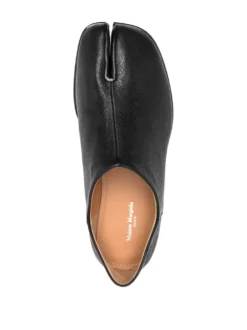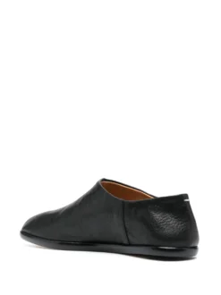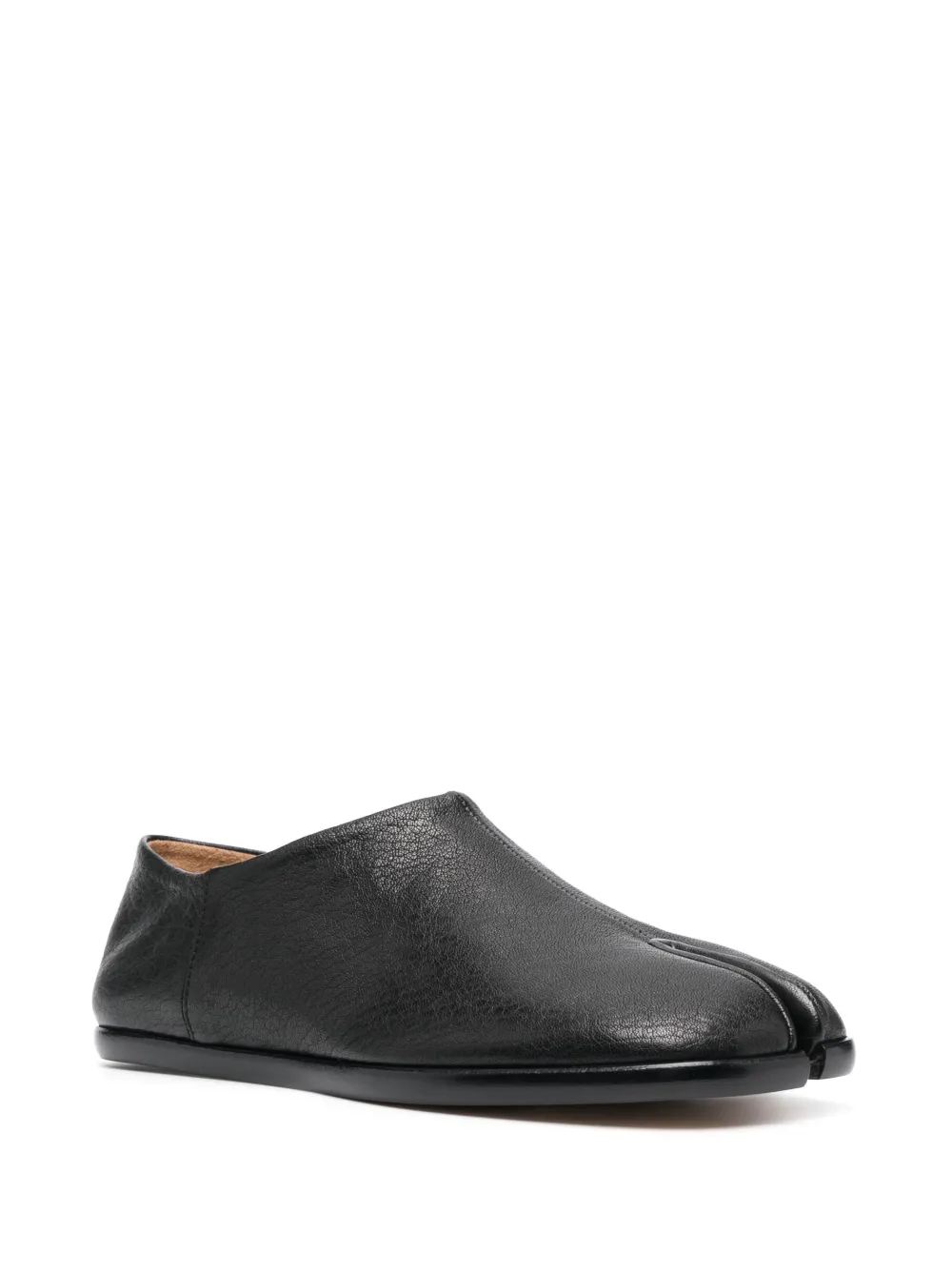 Expert craftsmanship, high-quality materials and a minimal aesthetic is a longstanding house code of Maison Margiela, producing refined wardrobe essentials season after season, like these black leather Tabi slip-ons. Featuring a leather insole, signature white stitching to the rear and a flat sole.
