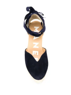 Dark blue jute ankle strap espadrilles from Manebi featuring a pointed toe, a branded insole, a high wedge heel, an ankle strap, a back tie fastening and a flat sole.