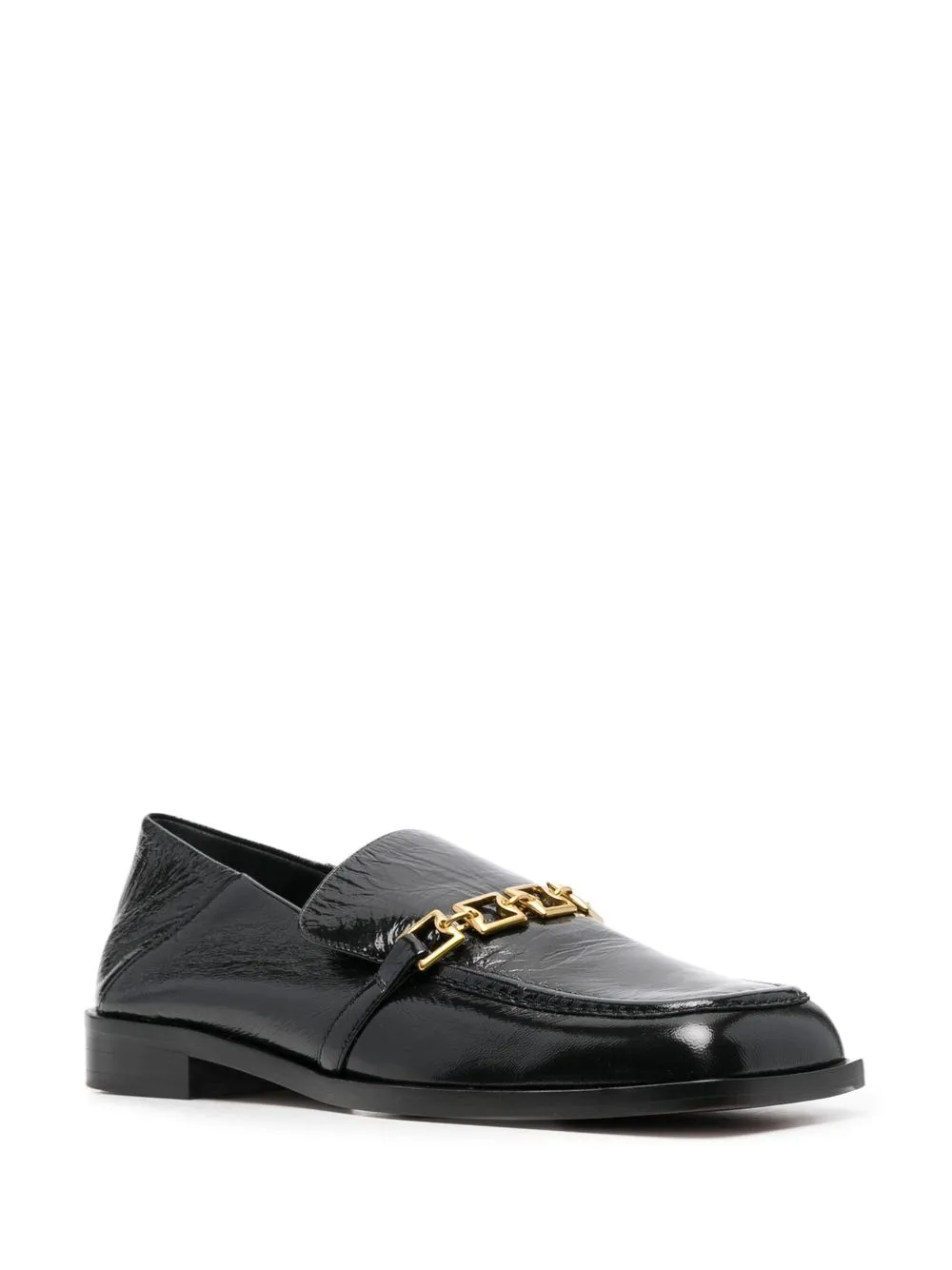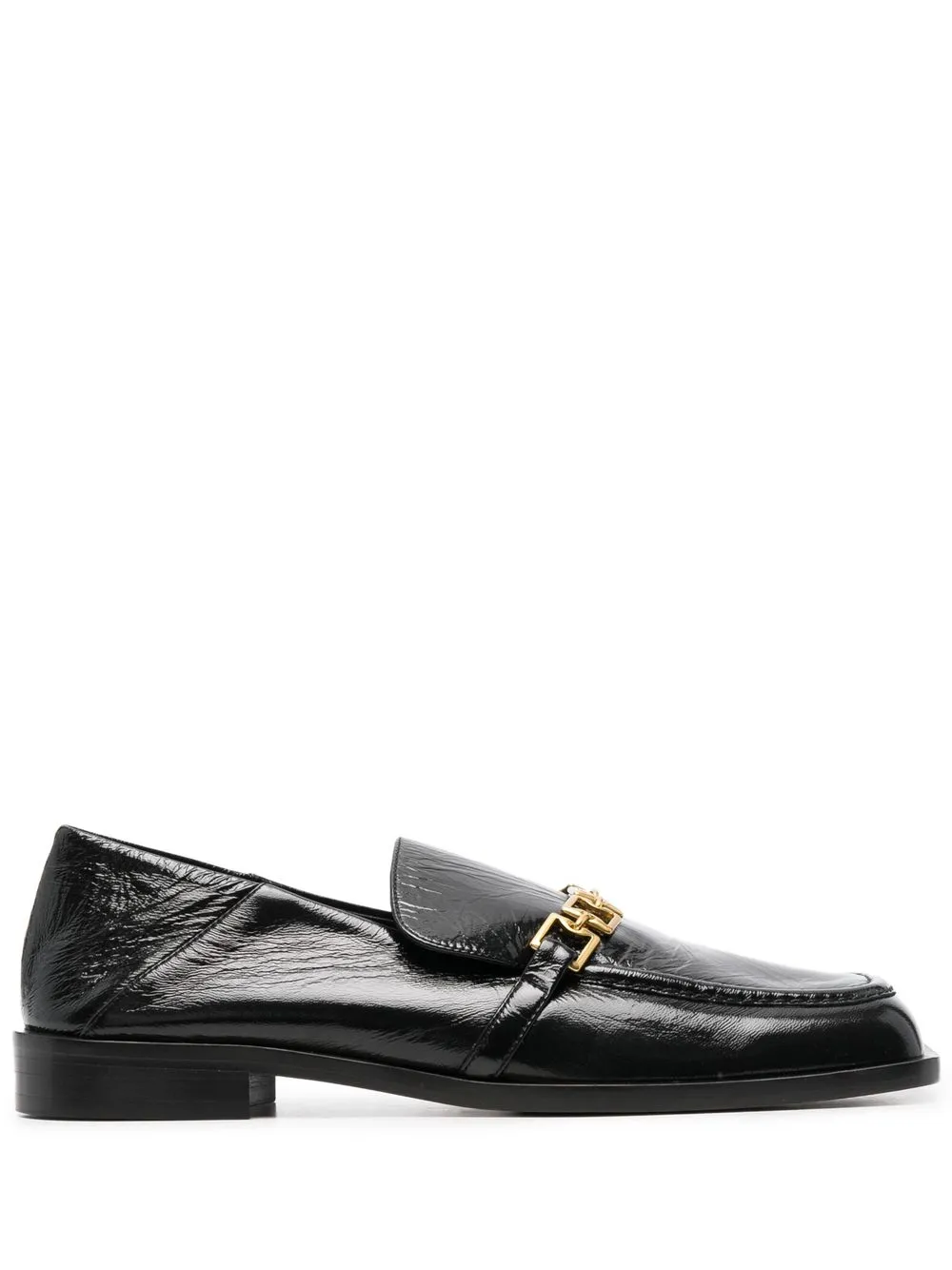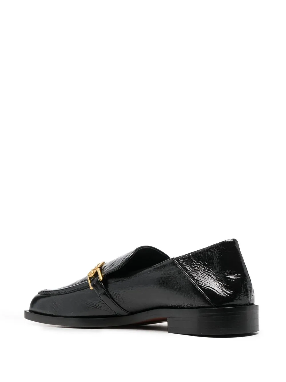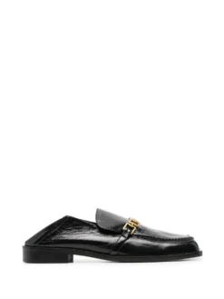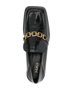 The Tap 25mm chain loafers from MANU ATELIER featuring black, calf leather, polished finish, chain-link detailing, gold-tone hardware, square toe, branded leather insole, folding heel, leather sole and slip-on style.