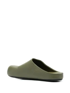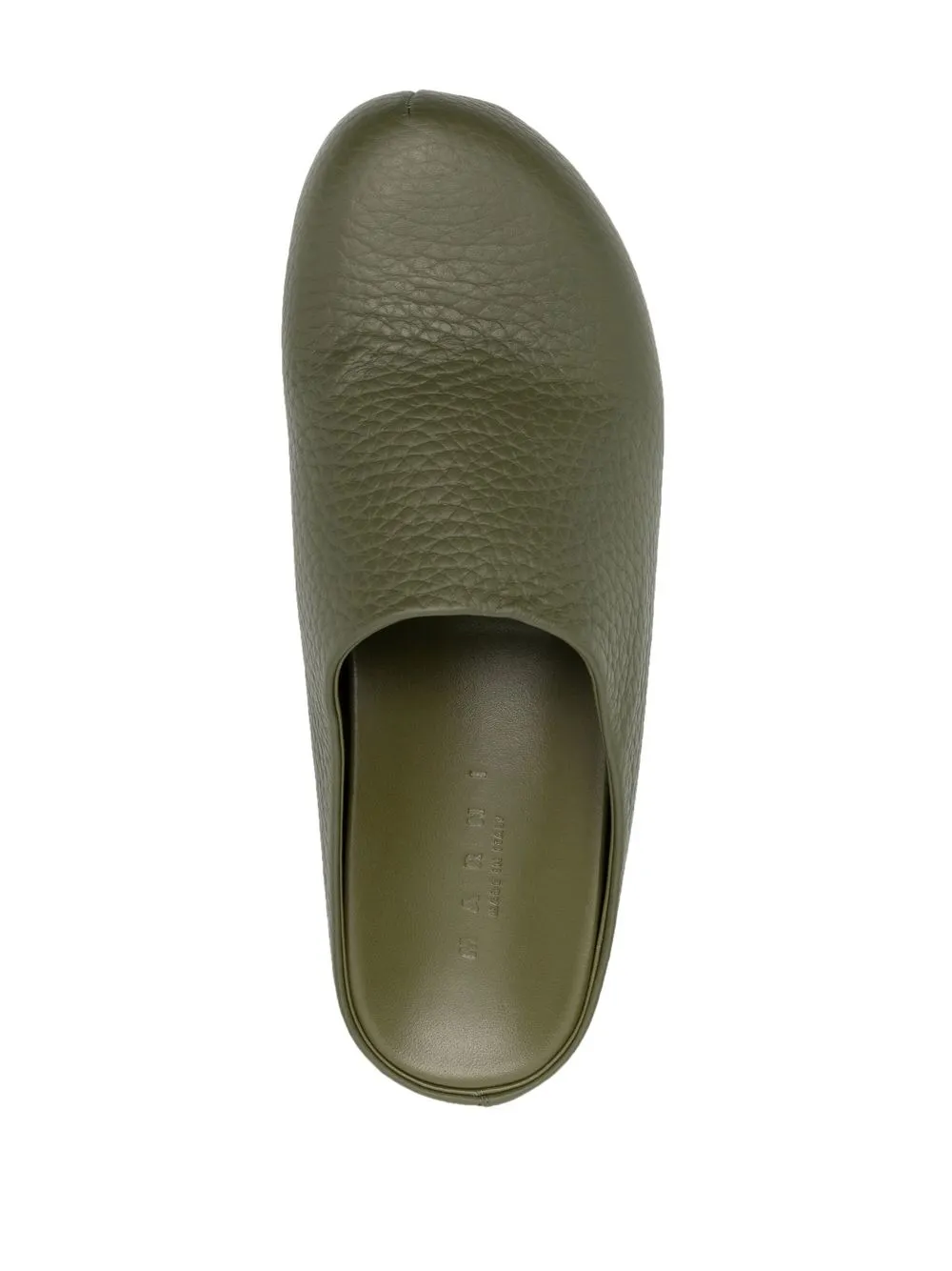 pebbled-textured clog slides from MARNI featuring military green, leather, pebbled texture, logo print to the side, round toe and slip-on style.