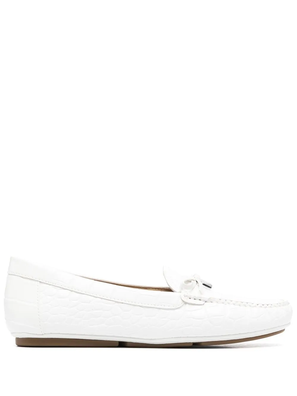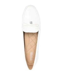 Juliette moccasin loafers from MICHAEL MICHAEL KORS featuring optical white, calf leather, bow detailing, padlock detail, tonal stitching, round toe, slip-on style, padded panels, branded leather insole and flat rubber sole.