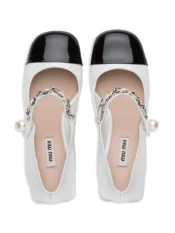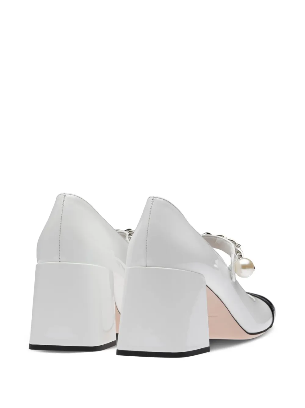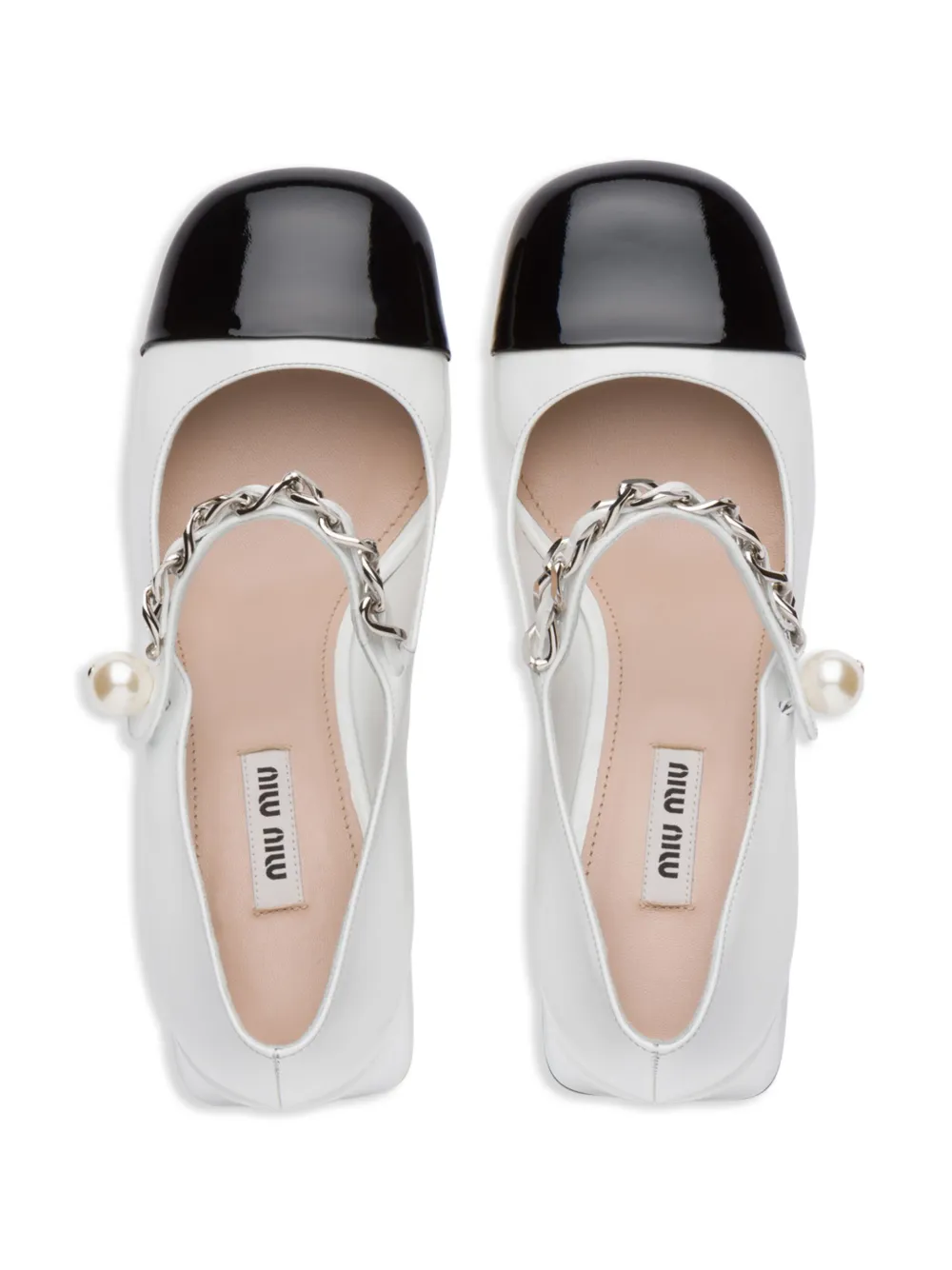 A romantic design and refined details define these patent leather pumps from Miu Miu. The instep strap is detailed with a metal chain and pearl on the closure for an elegant finish while the contrasting toe cap and high block heel cement a striking aesthetic.