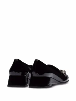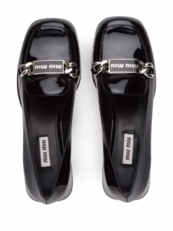 Black leather patent leather logo-plaque loafers from MIU MIU featuring logo plaque at the tongue, slip-on style, square toe, branded leather insole, low block heel and rubber sole.