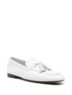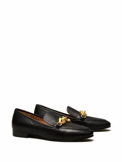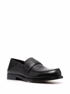 Black leather patent leather logo-plaque loafers from MIU MIU featuring logo plaque at the tongue, slip-on style, square toe, branded leather insole, low block heel and rubber sole.