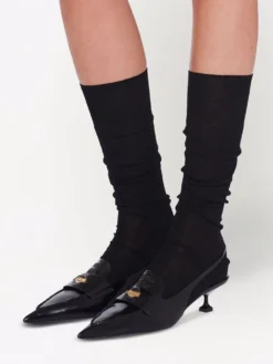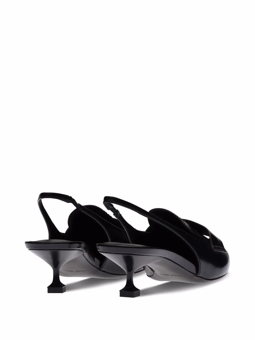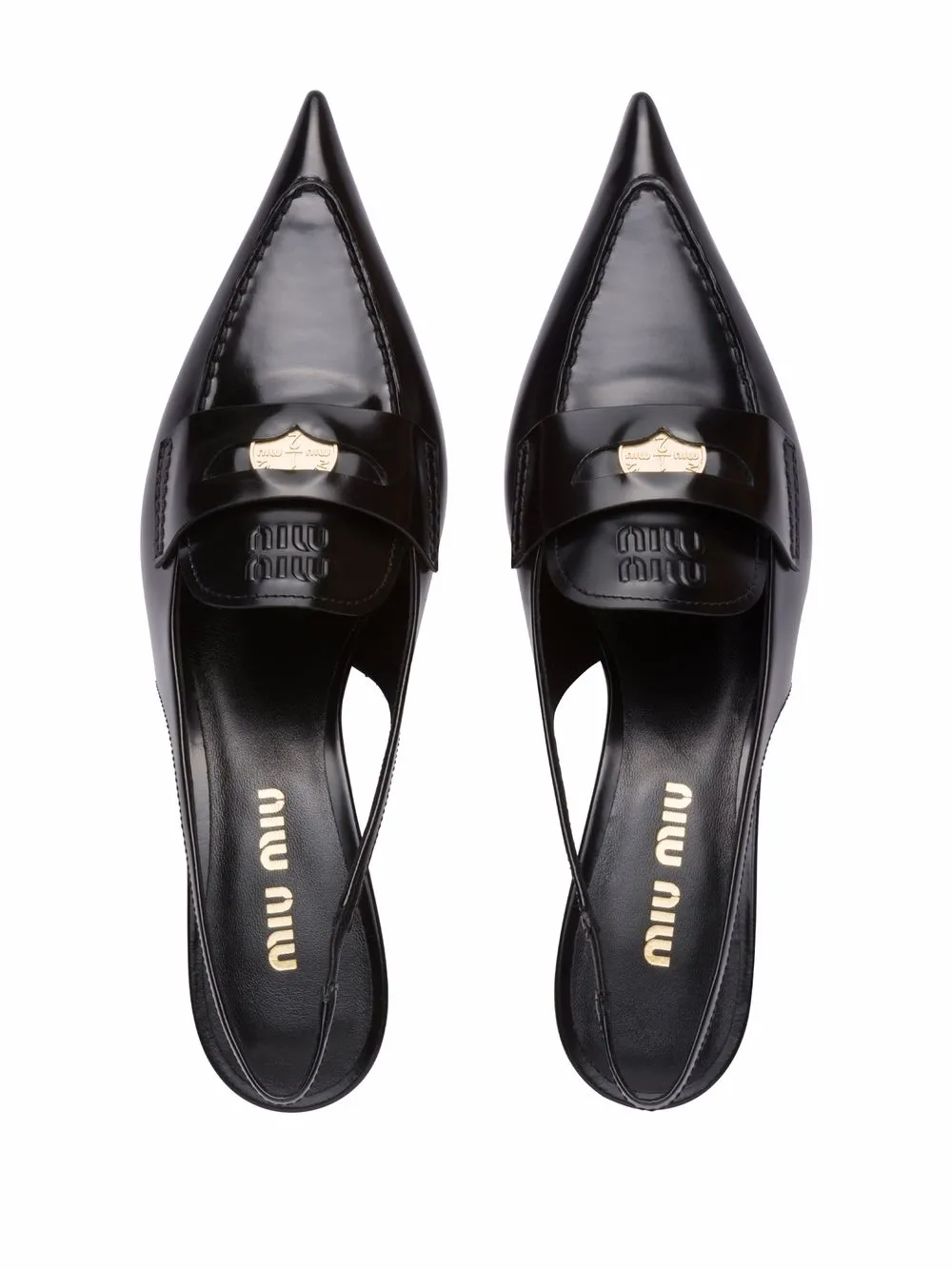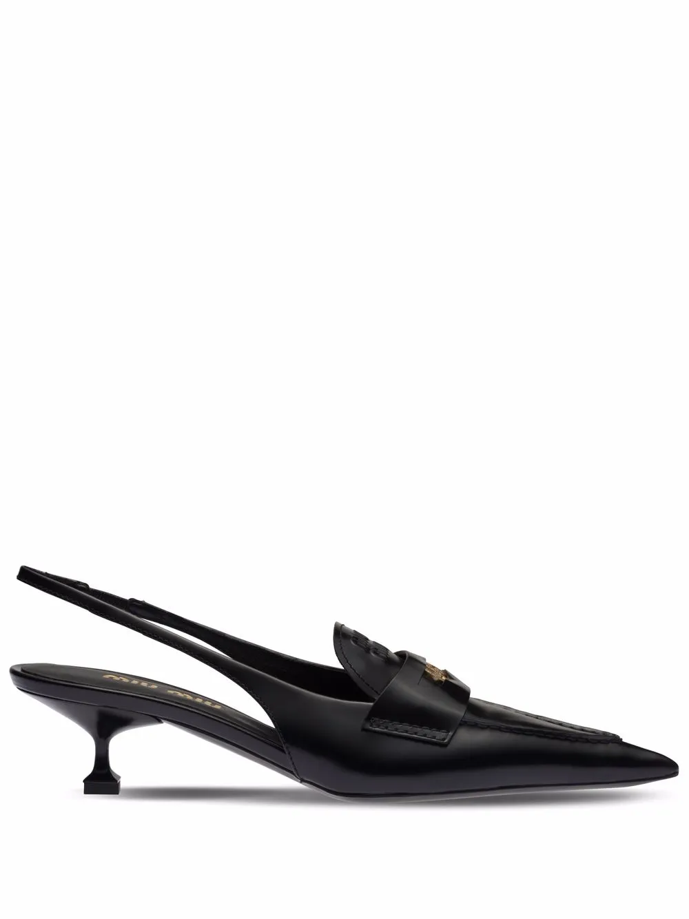 Black leather slingback kitten heel loafer pumps from MIU MIU featuring gold-tone hardware, pointed toe, penny slot, branded insole, slingback strap and kitten heel.