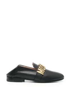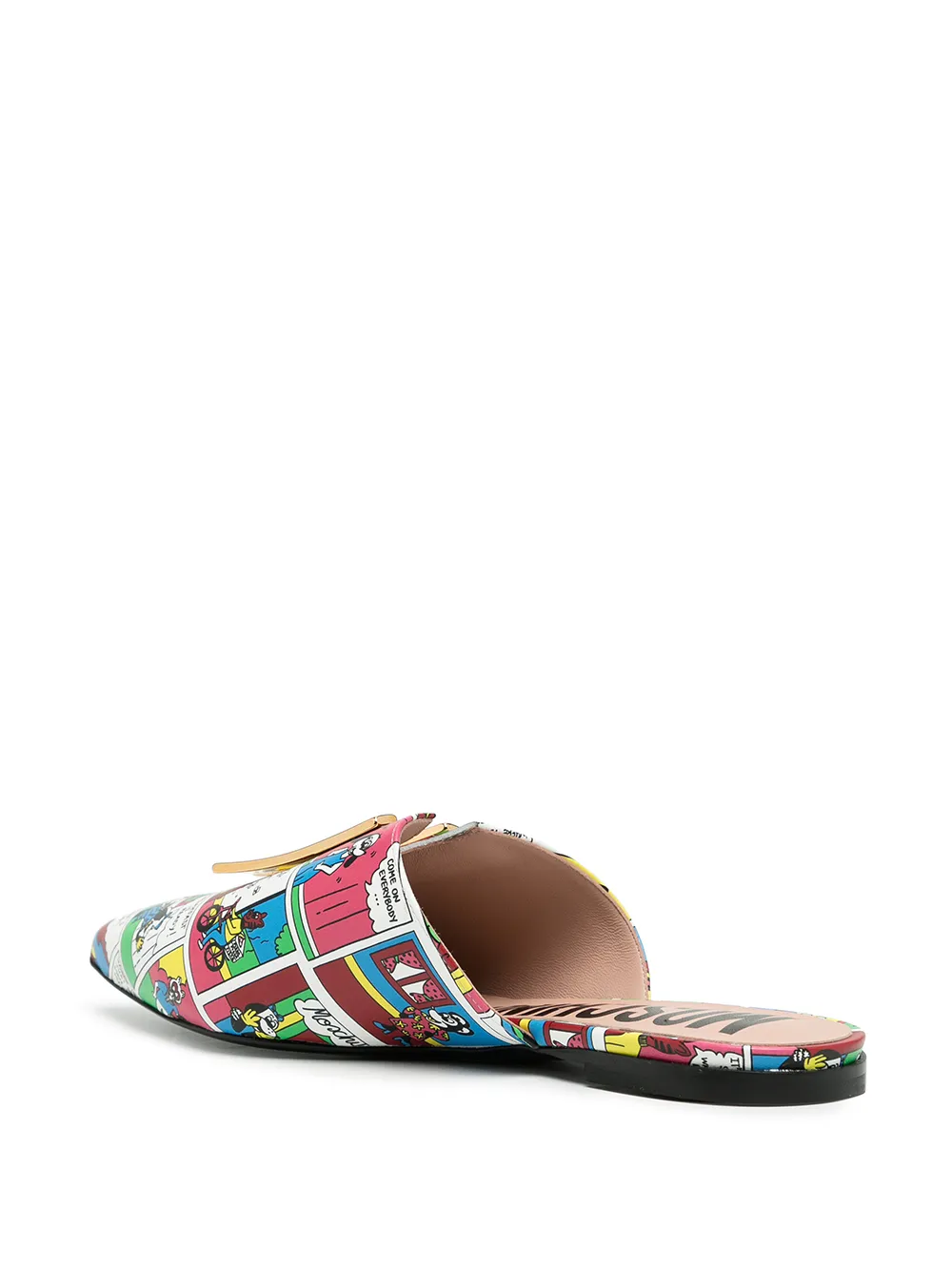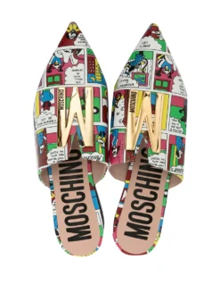 Multicolour leather comics-print flat slippers from MOSCHINO featuring all-over graphic print, gold-tone logo lettering, pointed toe, slip-on style, branded insole and flat leather sole.