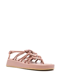 woven jute flat sandals from Nº21 featuring beige, jute, calfskin leather strap, calf leather, interwoven strap detailing, silver-tone logo lettering, open toe, single toe strap, branded insole, flat leather sole and slip-on style. Conscious: This item contains at least 50% low-impact materials, which are certified or widely recognised as having a lower environmental impact..