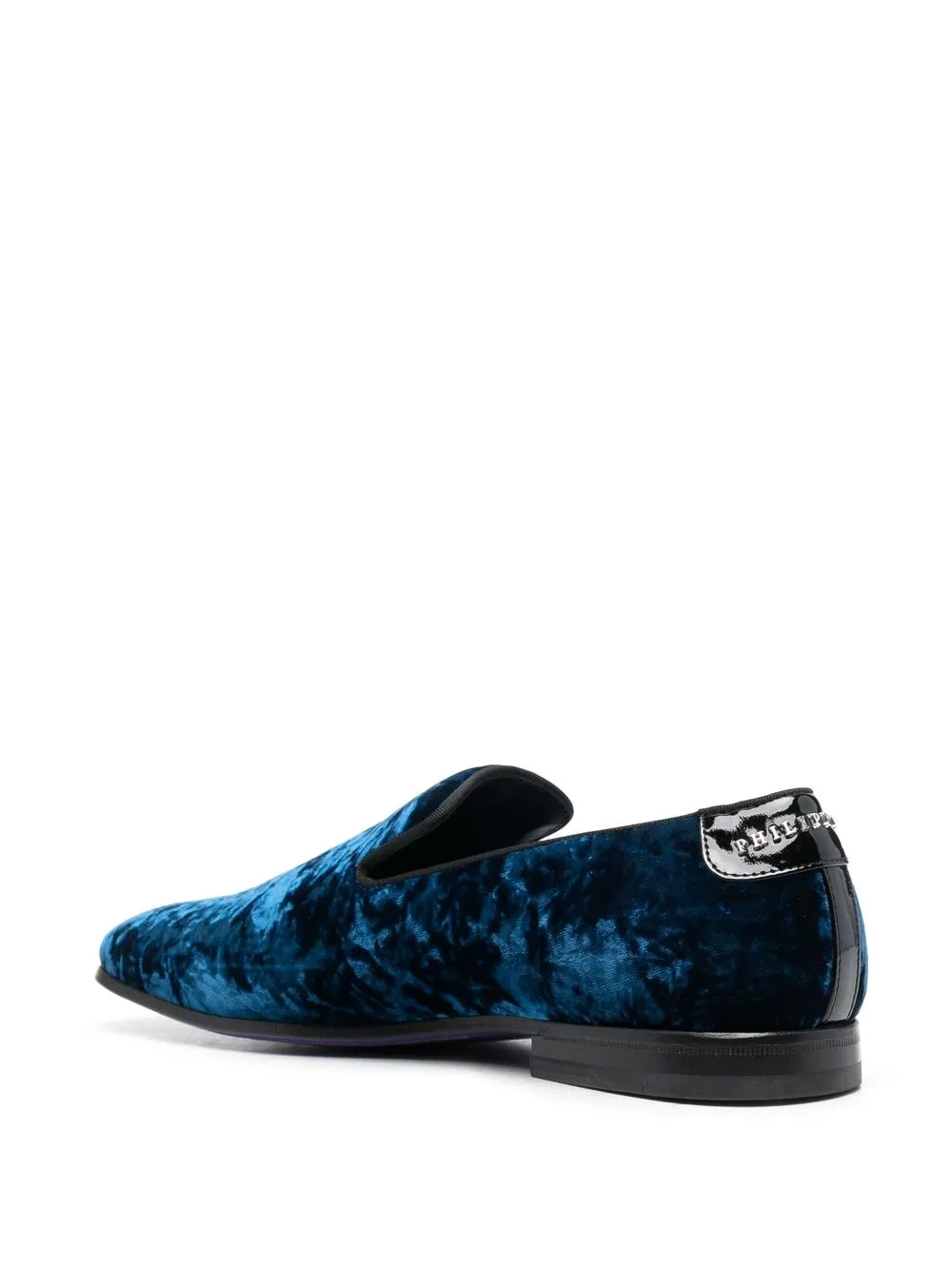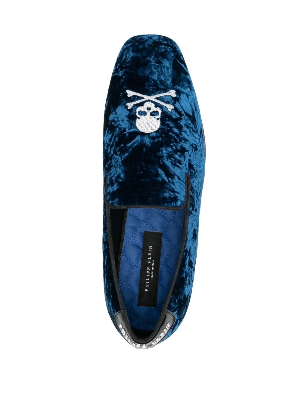 skull-appliqué slippers from PHILIPP PLEIN featuring royal blue, crushed velvet, skull appliqué, logo patch to the rear, almond toe, quilted lining, branded insole, low block heel, slip-on style and calf leather trim.