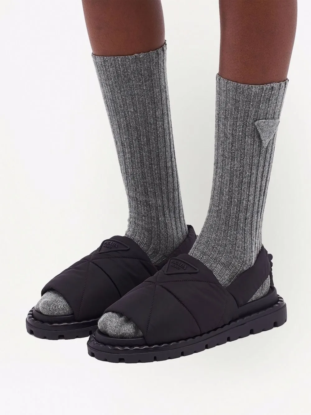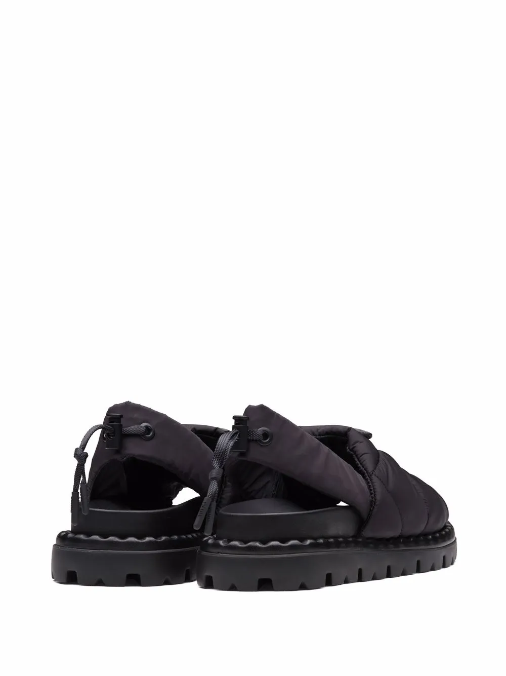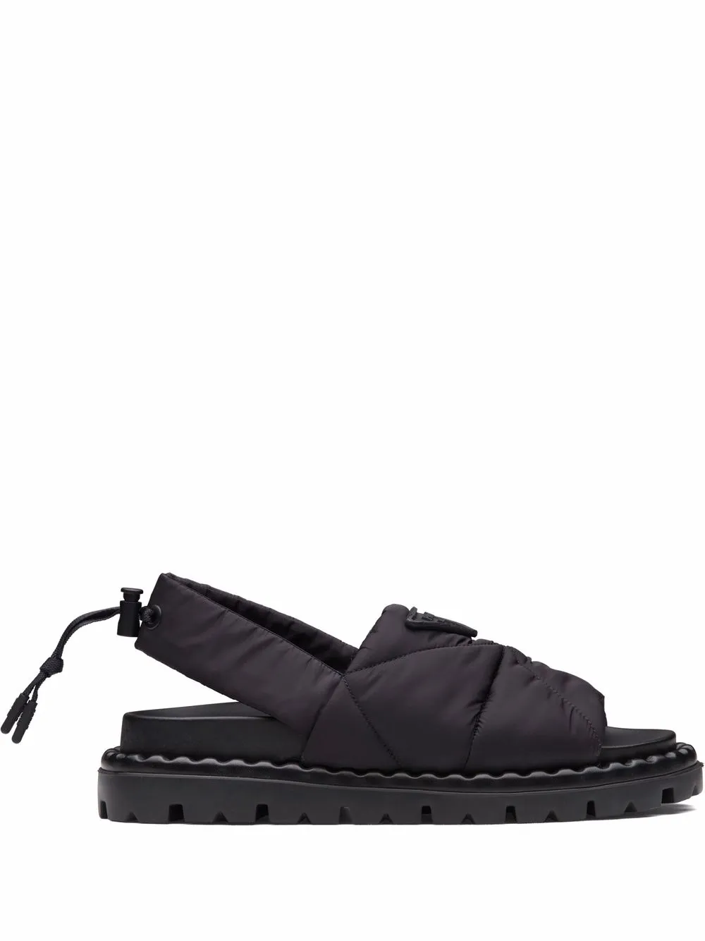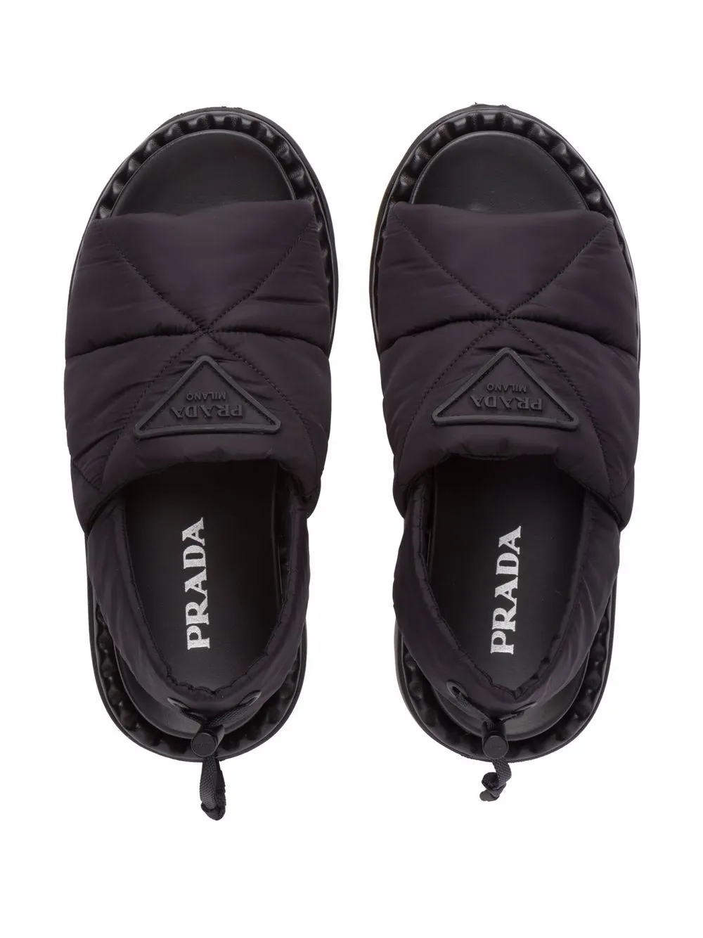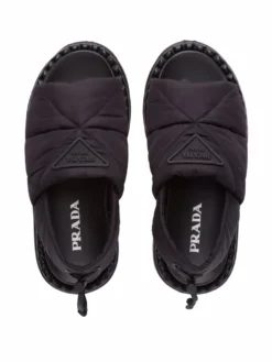 Prada’s affinity for contemporary hybrid designs that push the boundaries of fashion is clear in this pair of sandals. Crafted with a lightweight nylon upper, the pair is padded and quilted and sits atop a contrasting chunky lug sole. The brand’s unmistakable triangle logo is embossed on the front for an elevated touch.