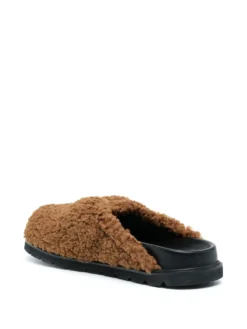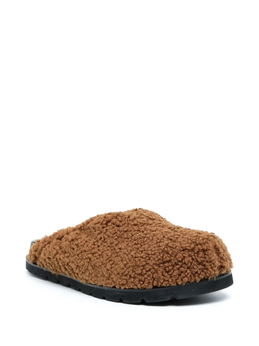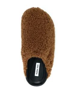 faux-fur slip-on loafers from REIKE NEN featuring slip-on style, faux shearling, round toe, branded insole, flat rubber sole, cognac brown and calf leather.