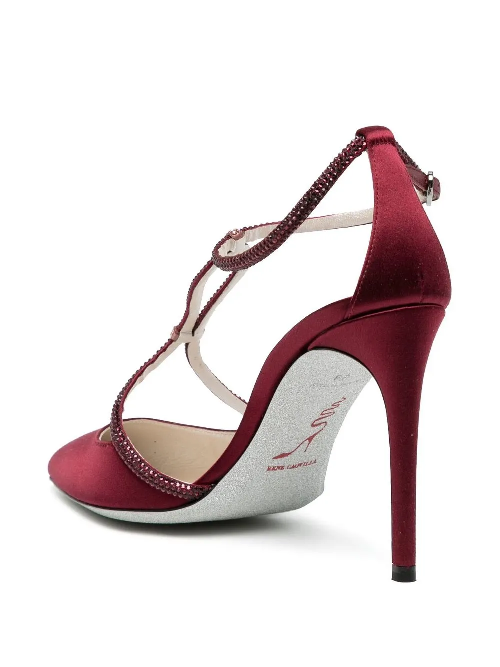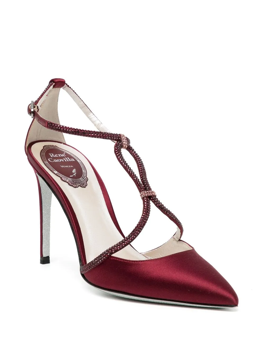 crystal-embellished high-heel pumps from René Caovilla featuring bordeaux red, satin weave, crystal embellishment, glitter detailing, branded leather insole, pointed toe, buckle-fastening ankle strap, branded leather insole and high stiletto heel.